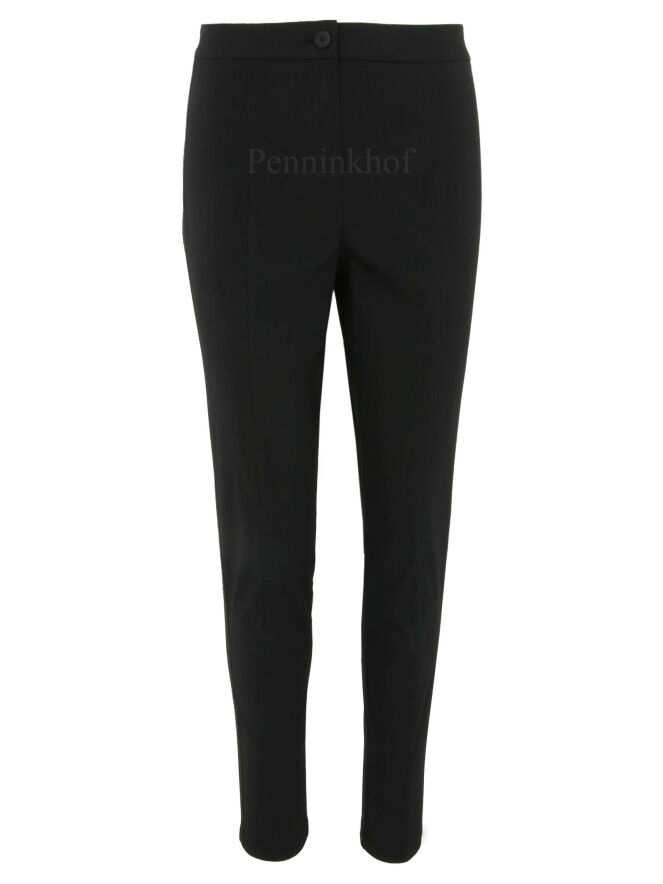 Een broek van Annette Görtz in de kleur zwart. langs de zijkant van de pijpen is een fijn geribbelde bies in dezelfde kleur als de broek. Deze broek mag op 30 graden worden gewassen.