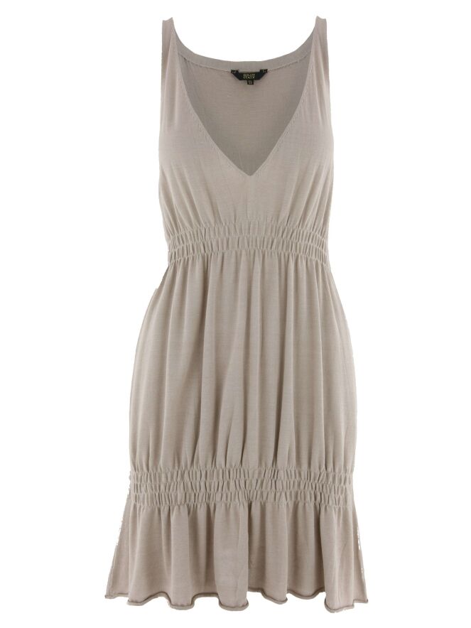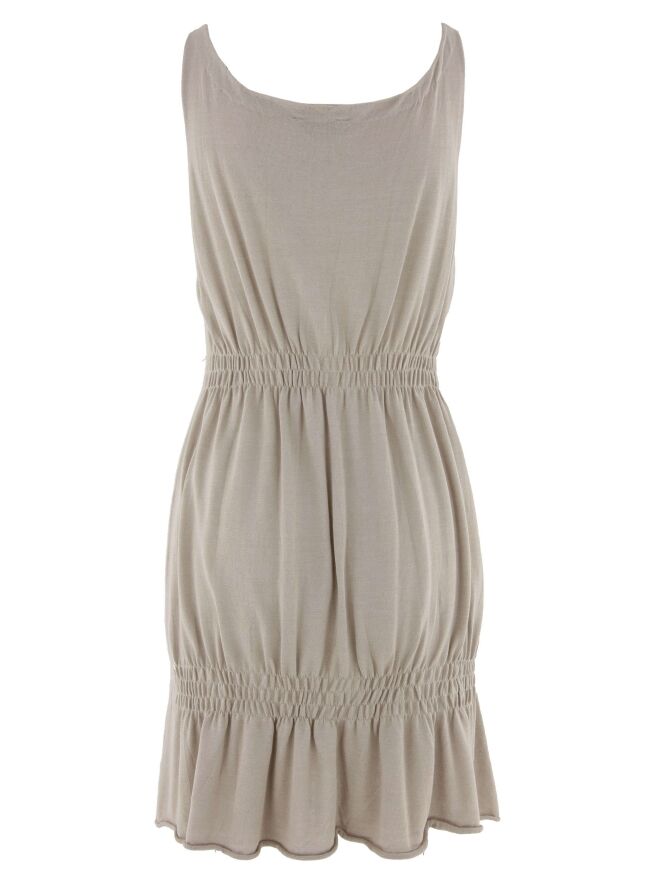 Een tuniek van 0039 in een zandkleur. In de taille en aan de onderkant is een 3 dubbele decoratieve stiknaad waartussen de stof fijn geplooid is. Het tuniek heeft een diepe V - Hals en mag op de hand worden gewassen.