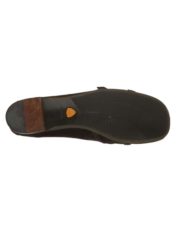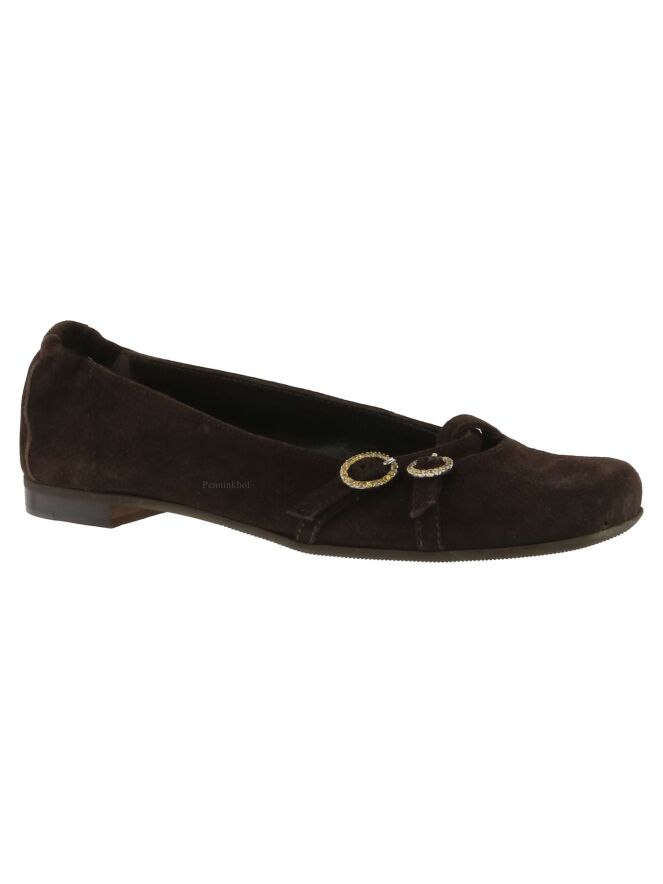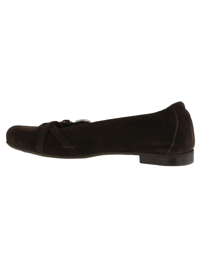 Een instapper van het merk AGL Attilio Giusti Leombruni in een mokka bruine kleur. De instapper heeft een vierkant neusje en over de voorvoet lopen 2 gekruiste biesjes met gespen die zijn gedecoreerd met stras steentje. De binnenkant van de schoen is met leder gevoerd.