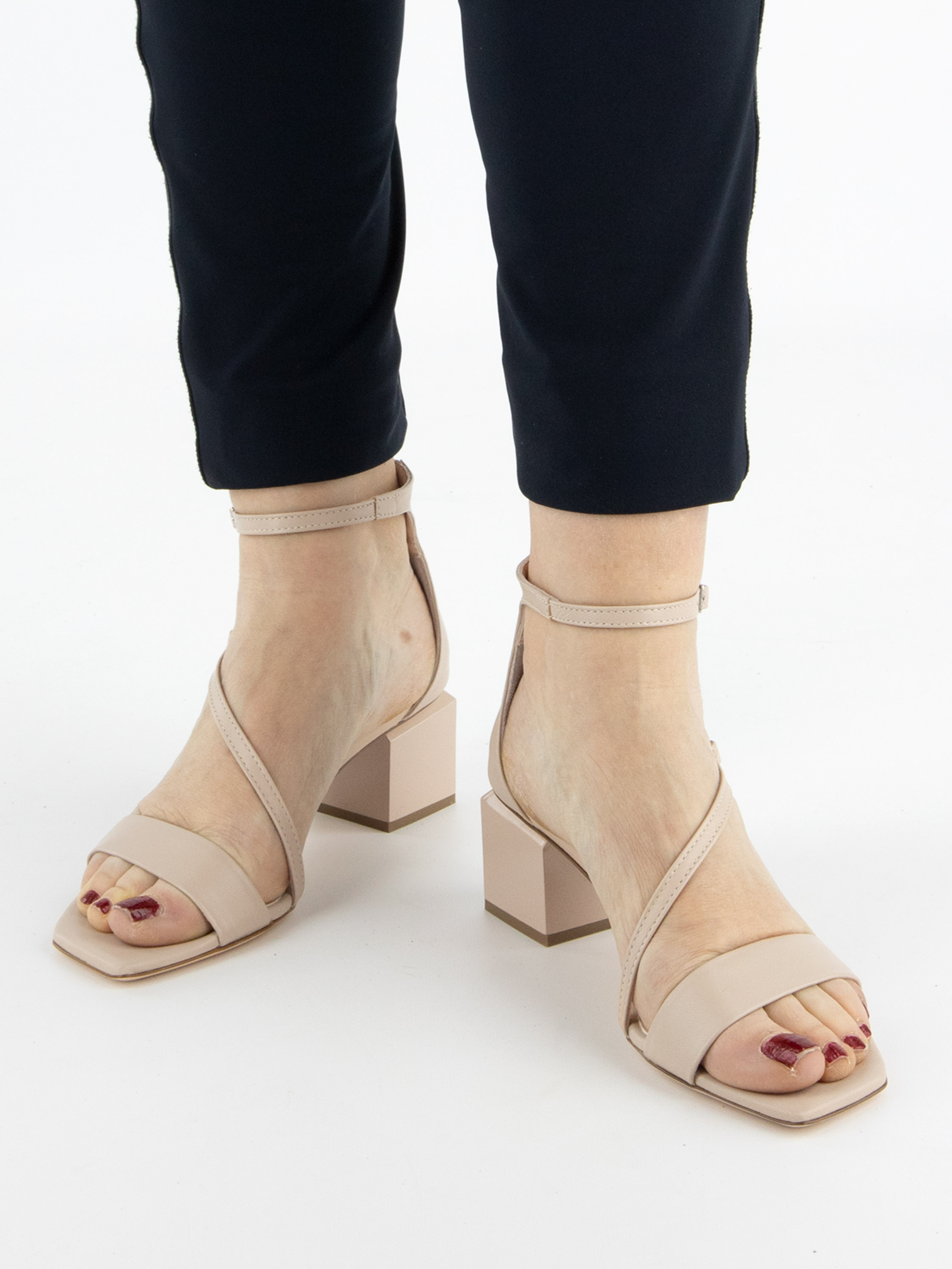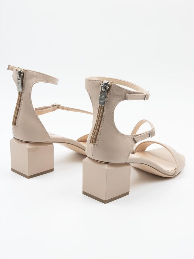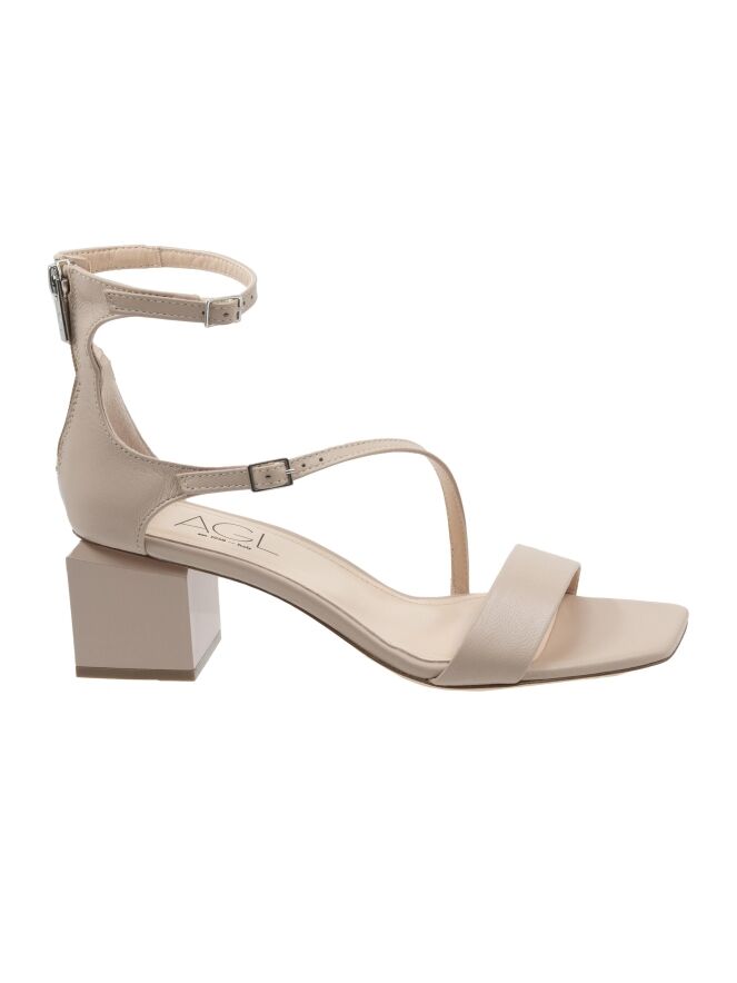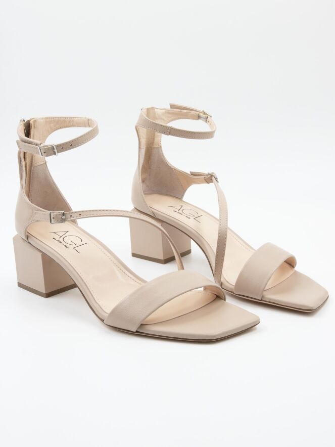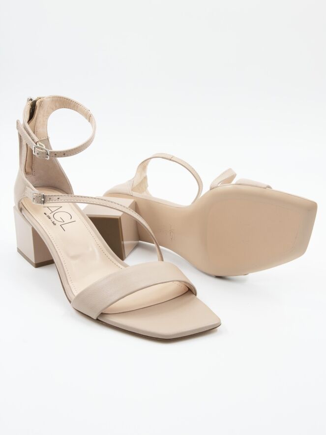 Een open sandaal of pump van AGL in de kleur nude. Over de voorvoet is een band. Met een smalle bies die vanuit deze band diagonaal over de voorvoet naar de zijkant van de hiel gaat. Het hielbandje is verstelbaar en op de hiel is een kort rits. De design hak is in een glanzende vierkante vorm. Het leder is aan de binnenkant gevoerd.