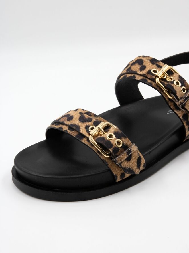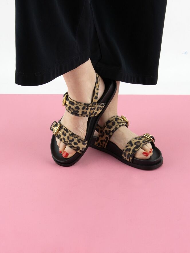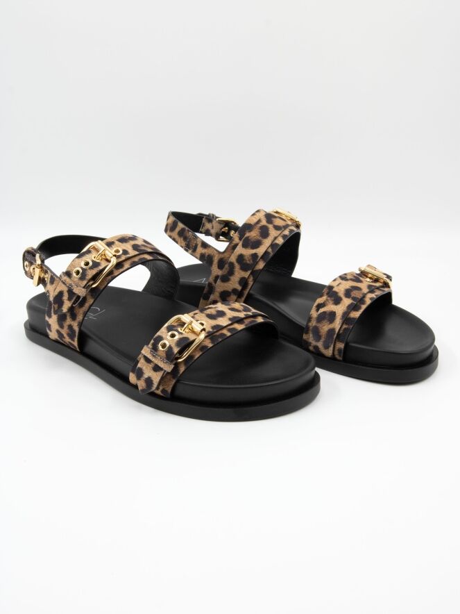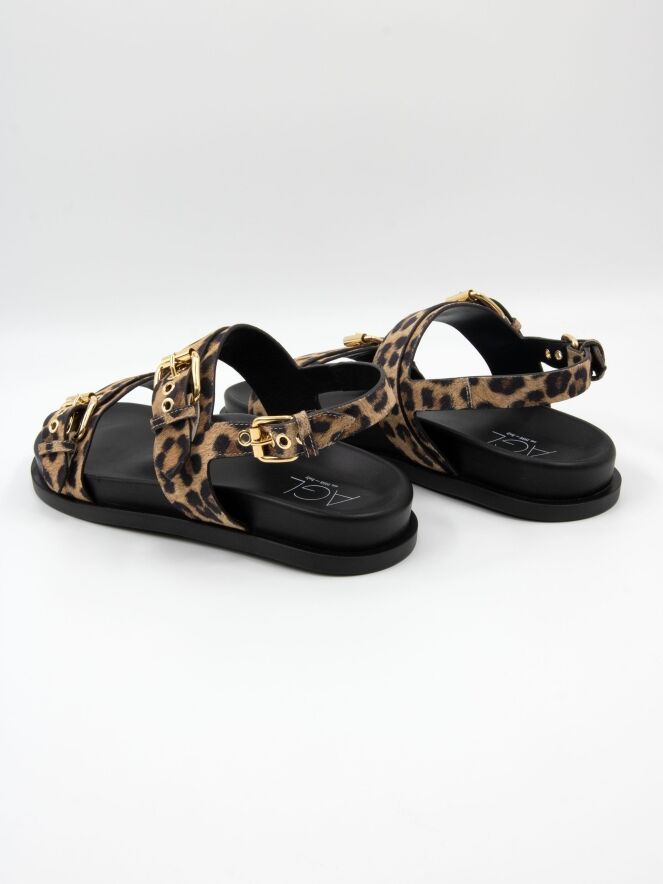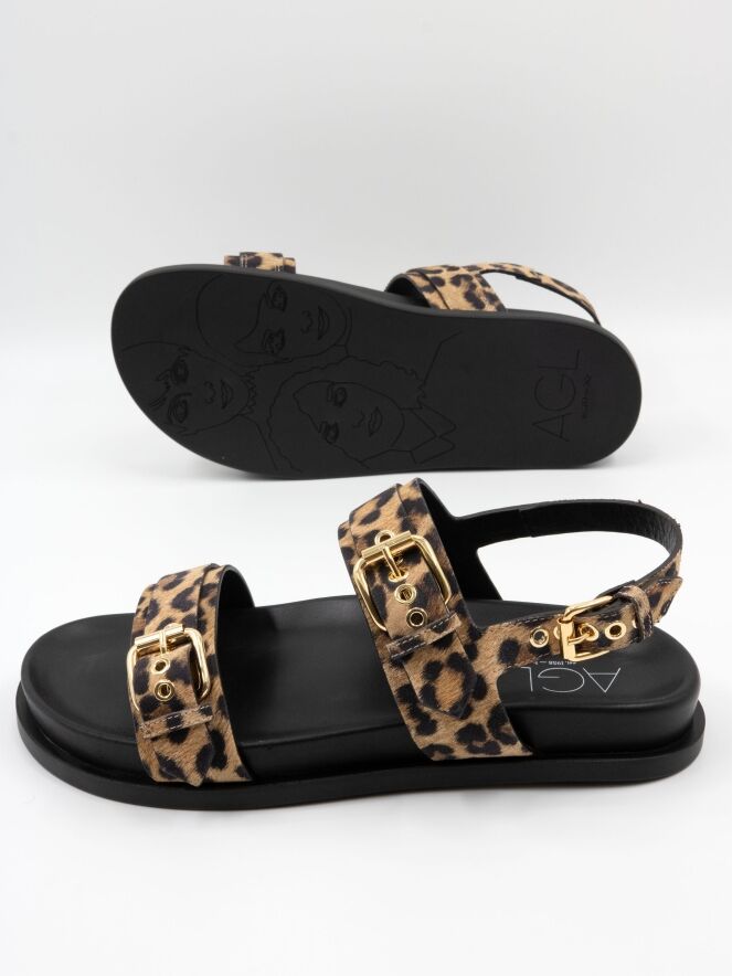 Een sandaal van AGL in een panterprint met de kleuren camel, cognac en zwart. Over de voorvoet lopen twee banden met een decoratieve goudkleurige gesp. Het hielbandje is verstelbaar. De zool en het voetbed zijn uitgevoerd in zwart.