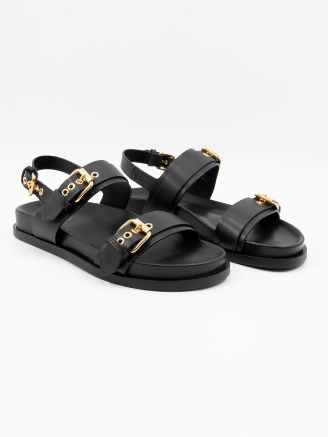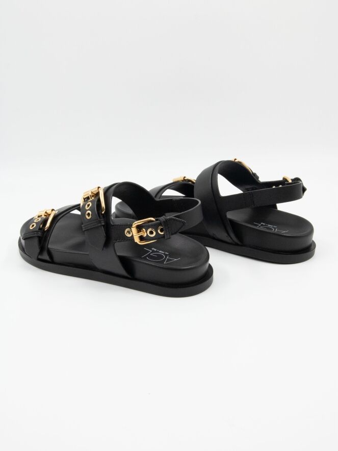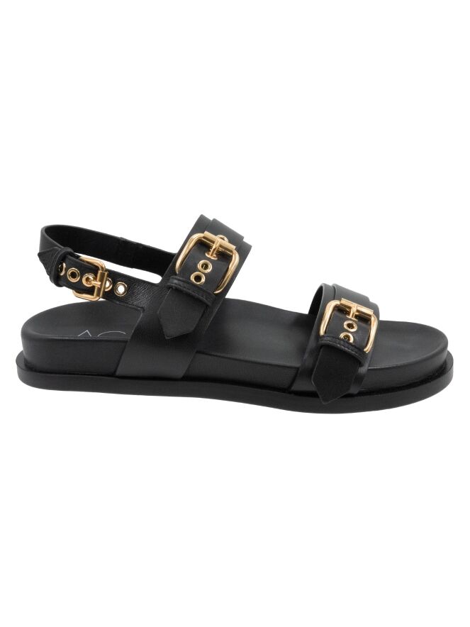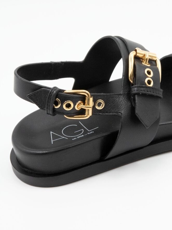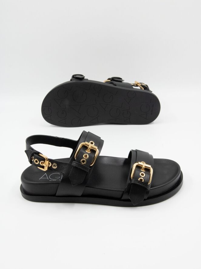 Een sandaal van AGL in de kleur zwart. Over de voorvoet lopen twee banden met een decoratieve goudkleurige gesp. Het hielbandje is verstelbaar. De zool en het voetbed zijn uitgevoerd in zwart.