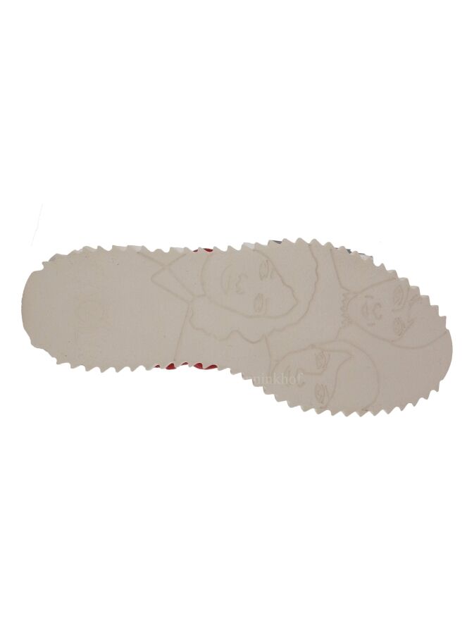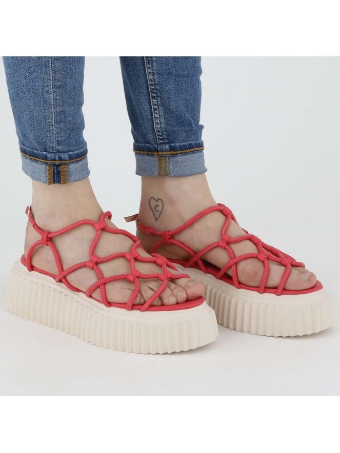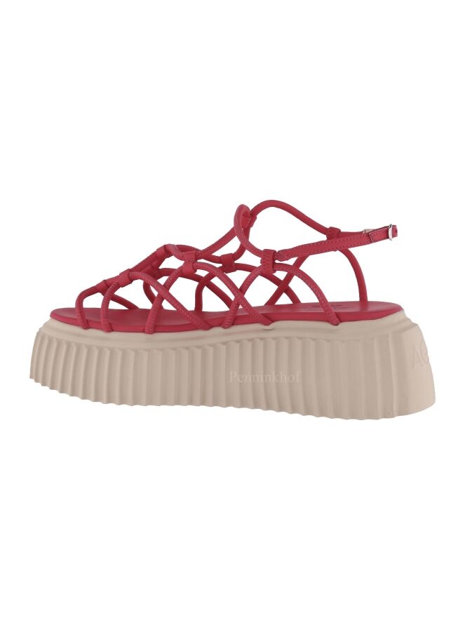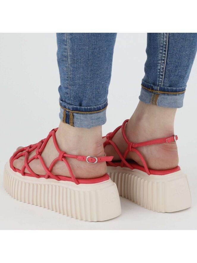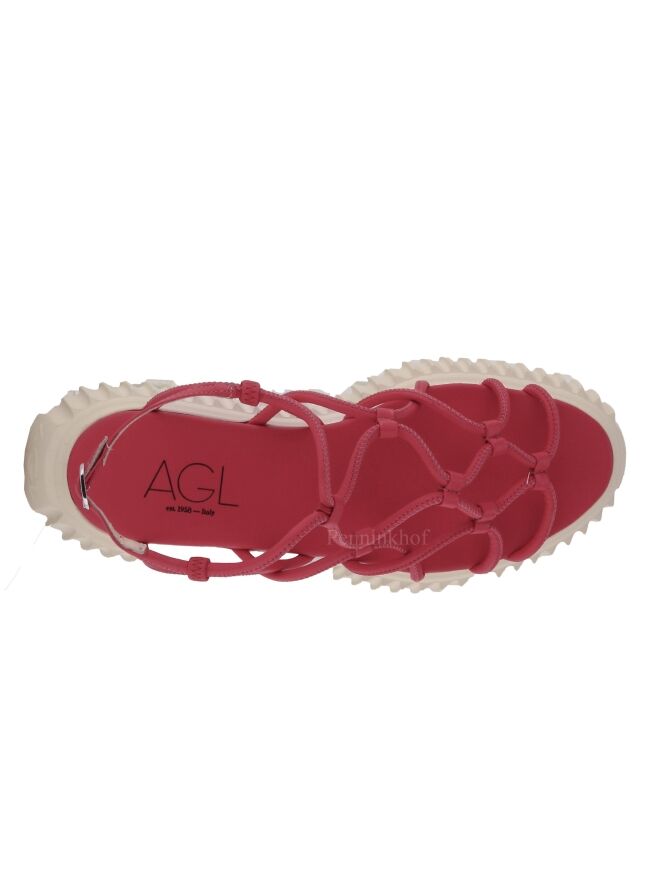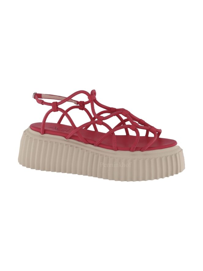 Een sandaal van AGL in de kleur framboos rood. Over de voorvoet zijn lederen koorden in een golvend patroon bevestigd. Het hielbandje is verstelbaar. De plateauzool is in een verticaal geribbelde structuur.