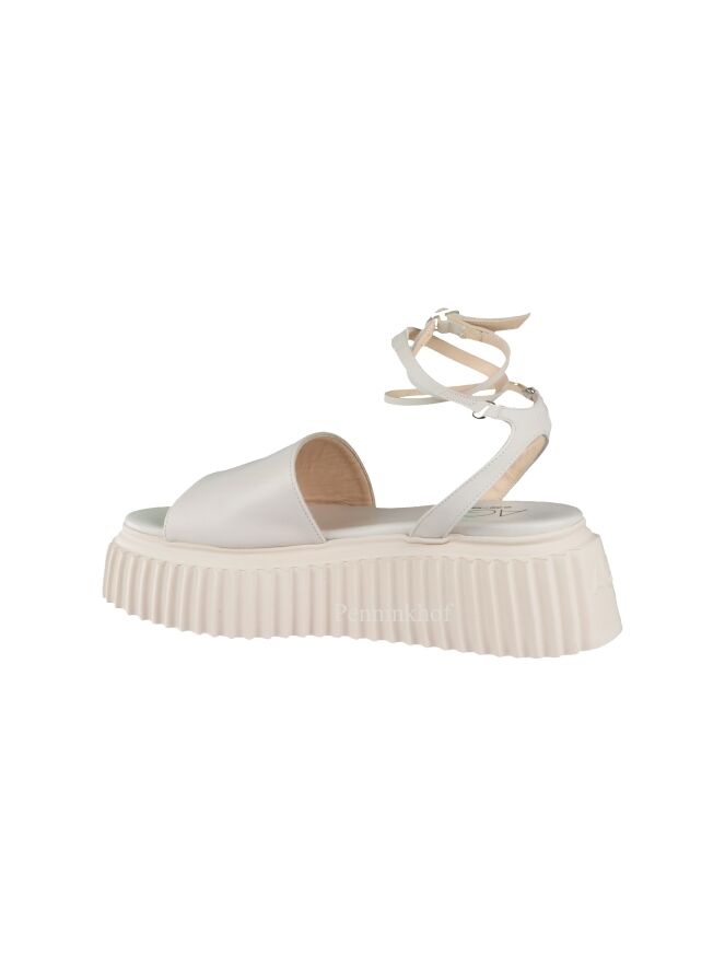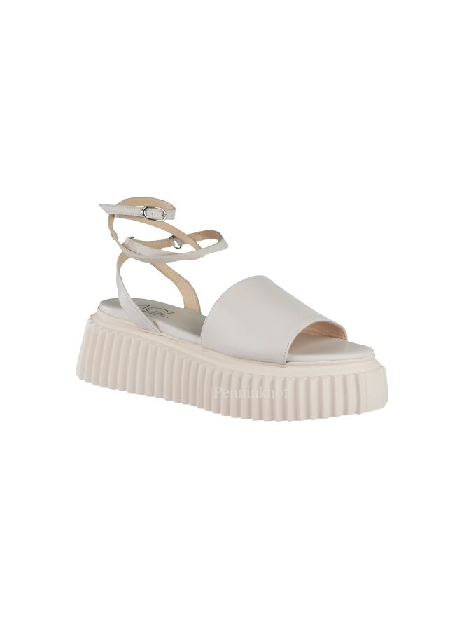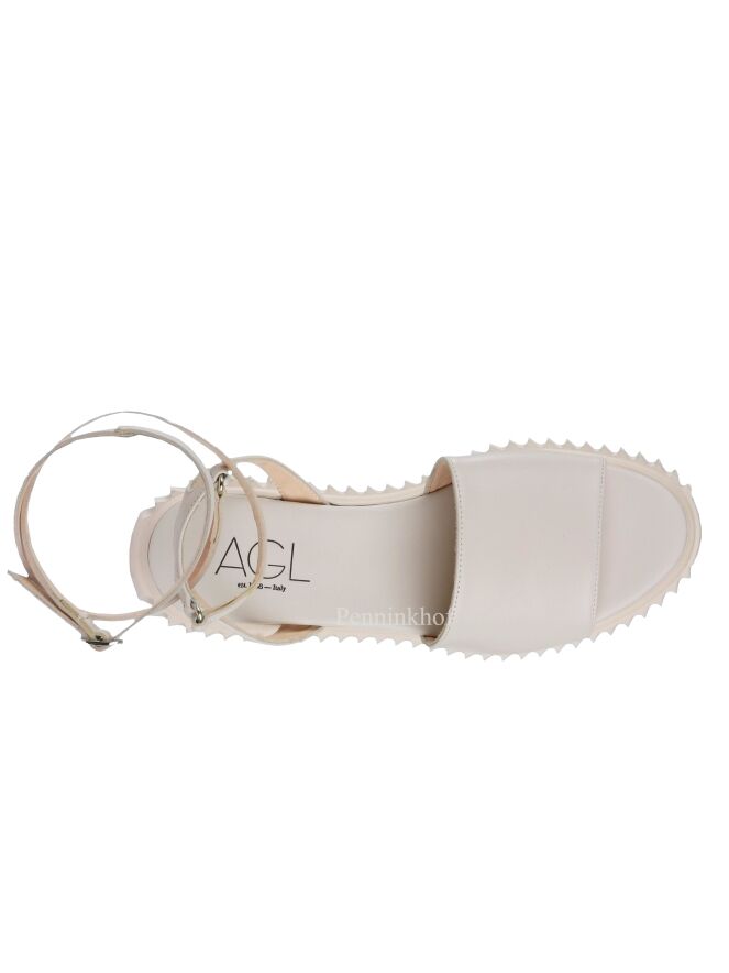 Een sandaal van AGL in een roomwitte kleur met een pastel roze invloed. De sportieve zool is gekarteld. Het lange enkelbandje is verstelbaar.