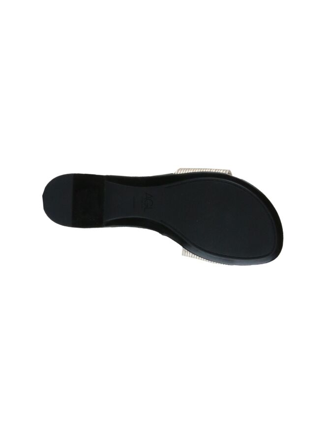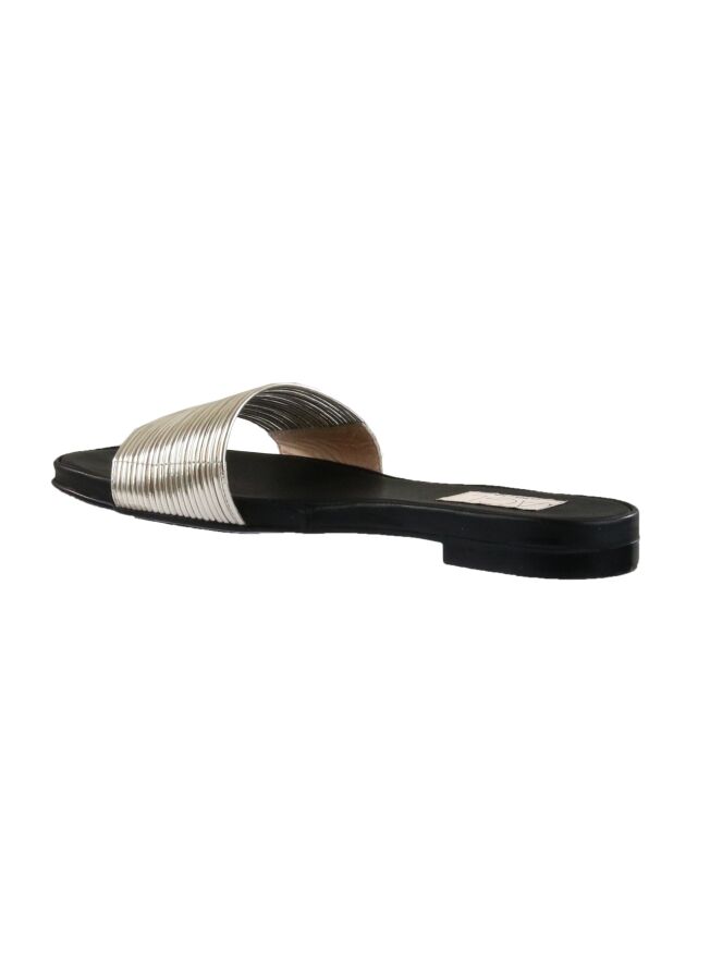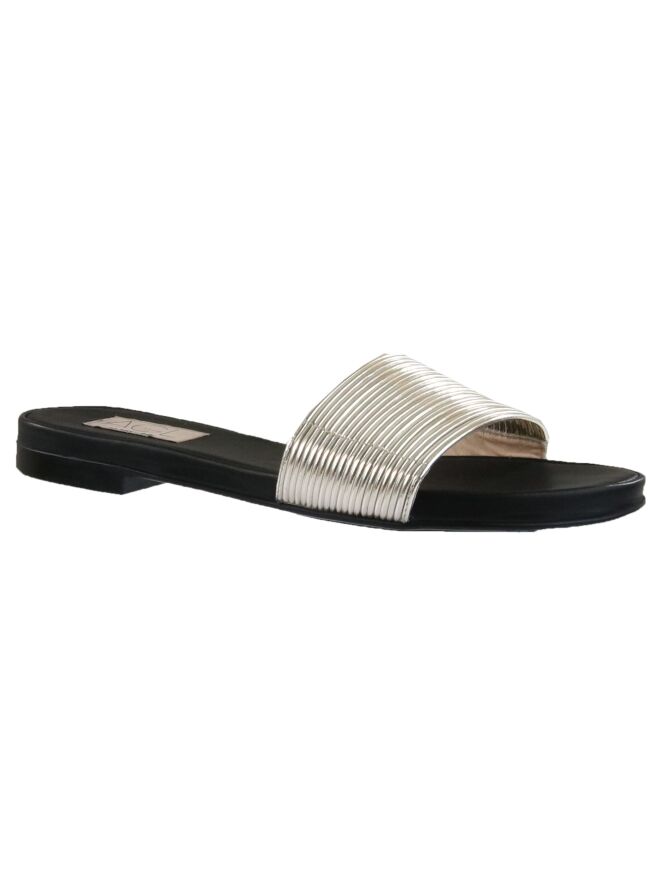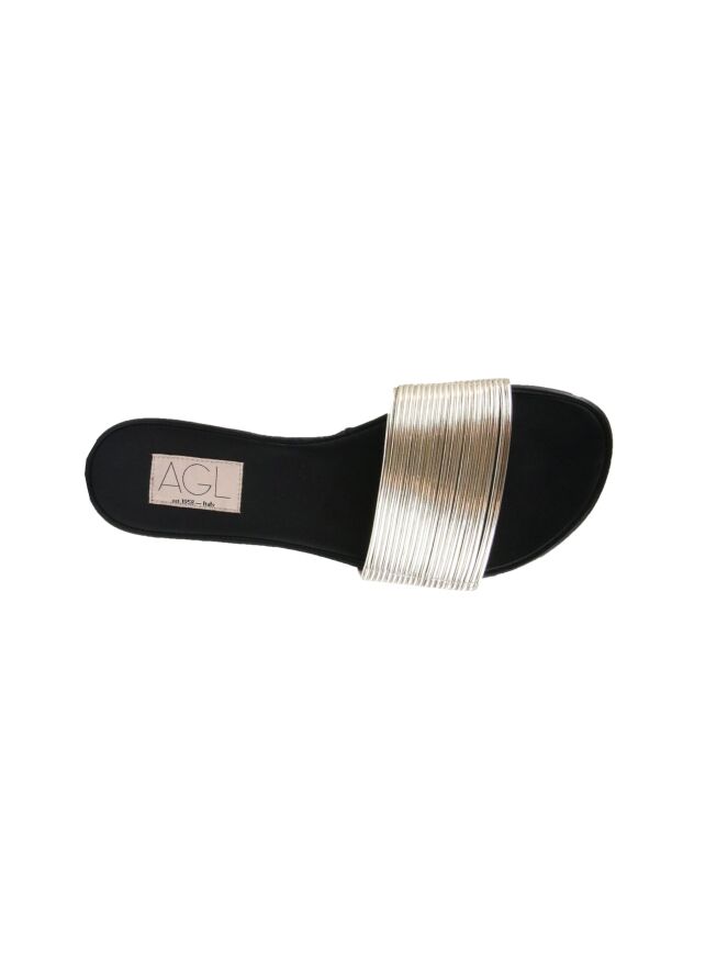 Een sandaal van Attilio Giusti Leombruni in een platinium kleur. De bedekking van de voorvoet is met fijne ronde lederen koorden op een zwart kleurige zool.