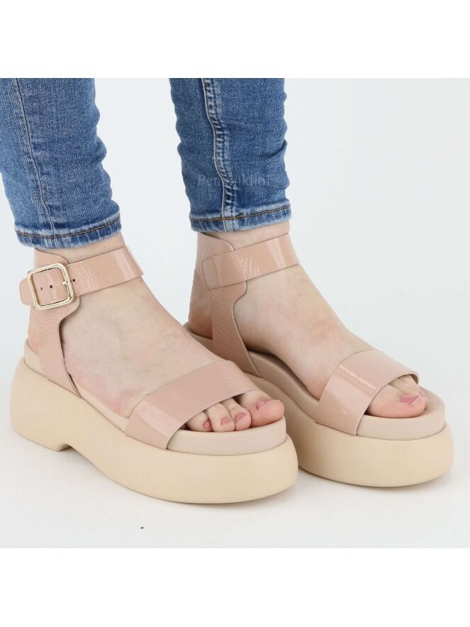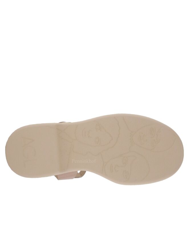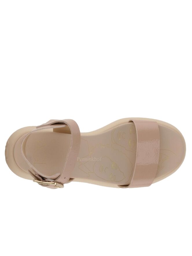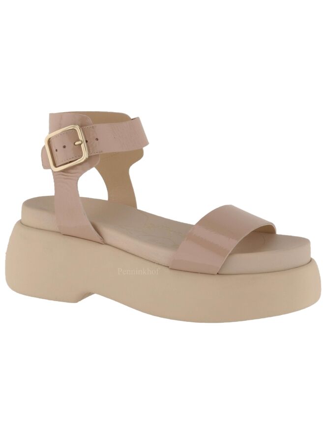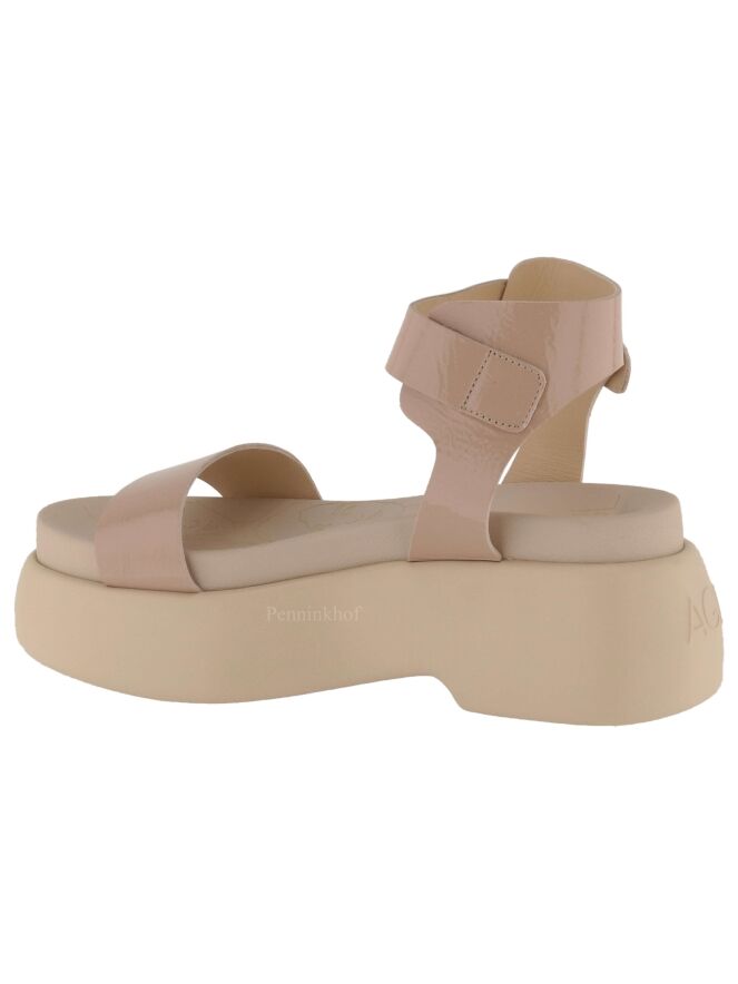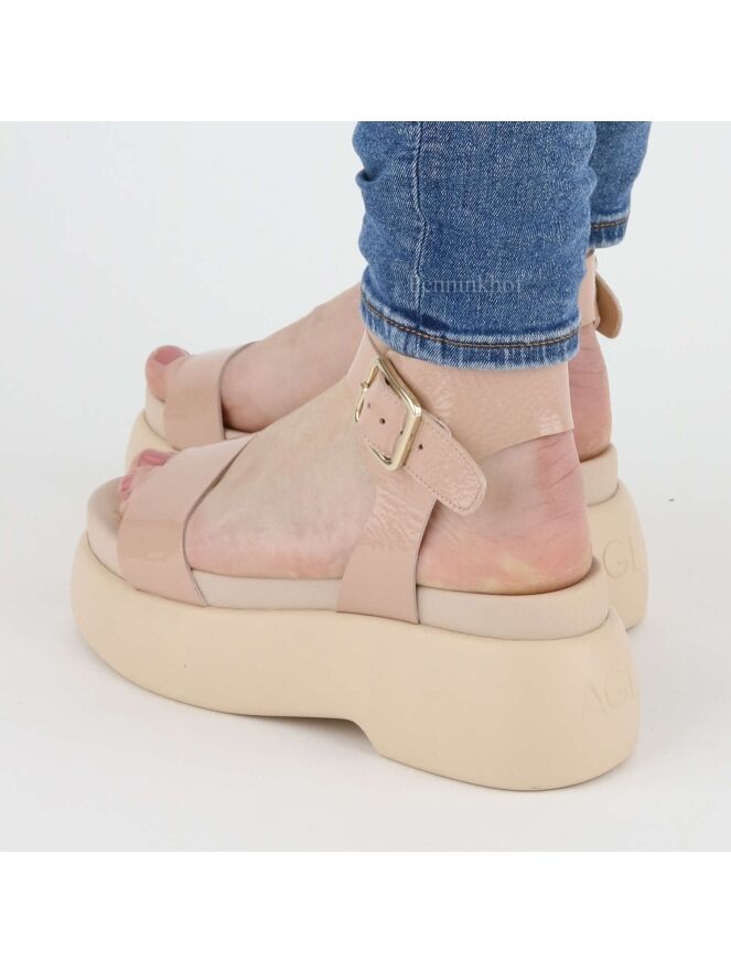 Een sandaal van AGL in lakleder in de kleur zwart. De sandaal heeft een design plateauzool met daarop een luxe voetbed met een grafische print van de 3 dochters van AGL. Over de voorvoet is een lak lederen band. De enkelband is verstelbaar.