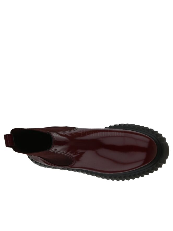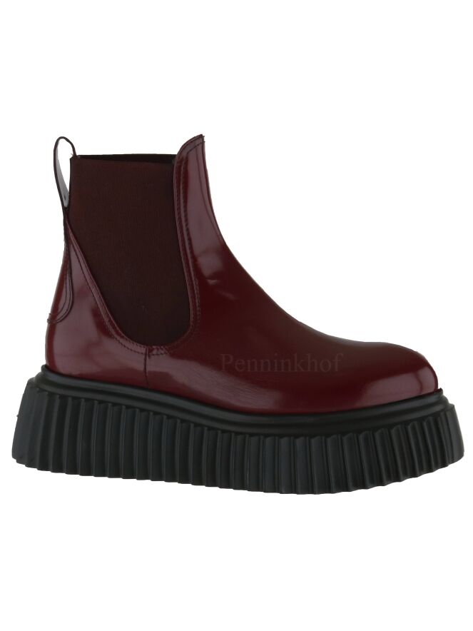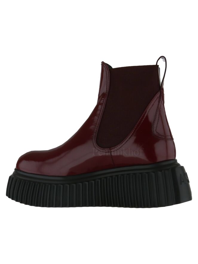 Een kort laarsje van AGL in de kleur bordeaux rood. Het laarsje heeft een geribbelde design plateau zool in de kleur zwart. Aan beide zijkanten van de schacht is een fijn geribbelde elastieken stof. De binnenkant is met leder gevoerd.