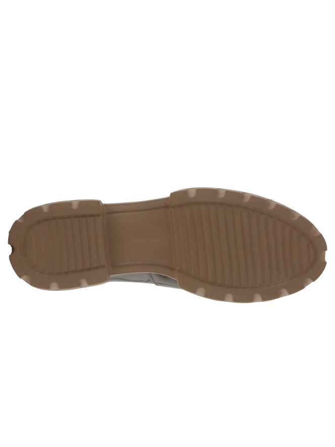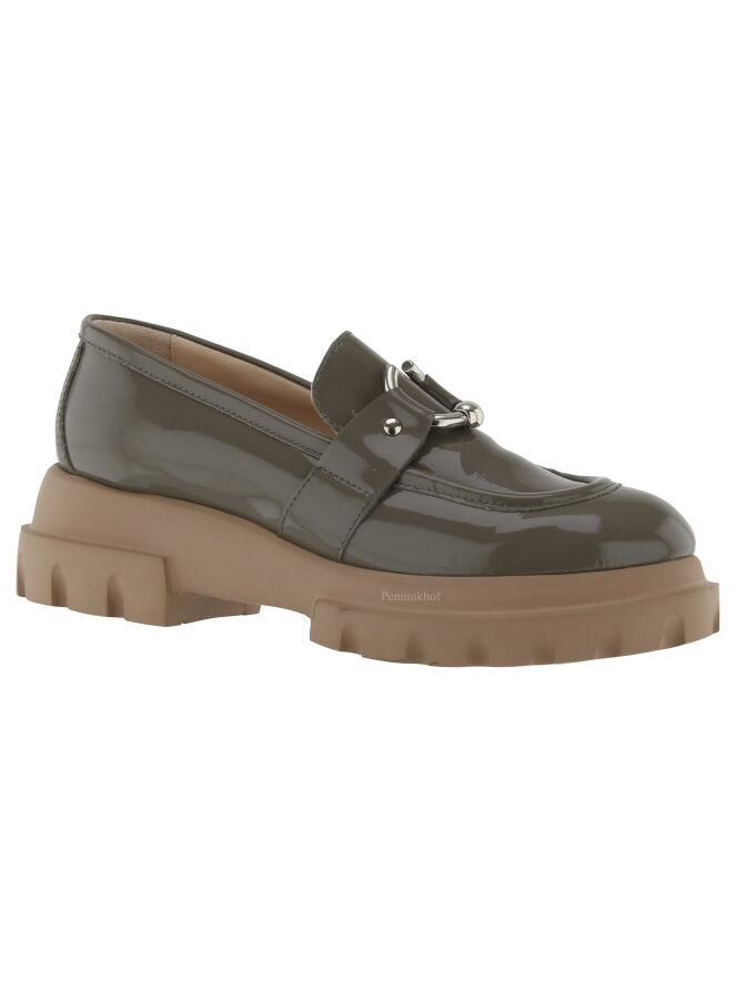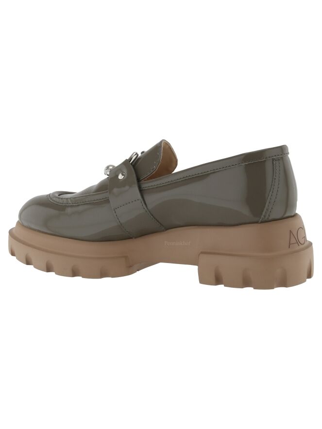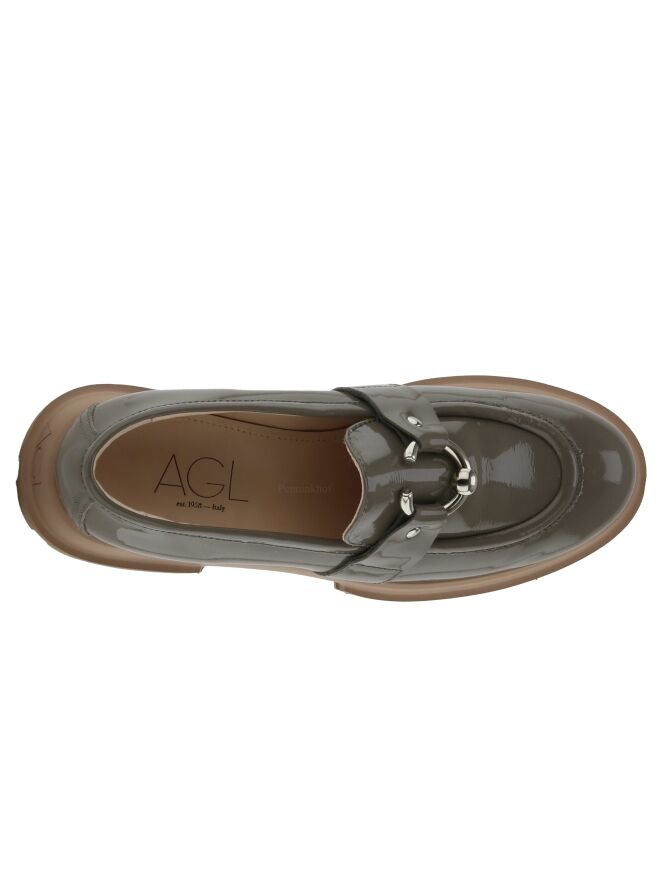 Een instapper van AGL in lakleder in de kleur grijs. De schoen heeft een design gekartelde plateauzool. op de voorvoet is een decoratief zilverkleurig bitje. De binnenkant is met leder gevoerd.