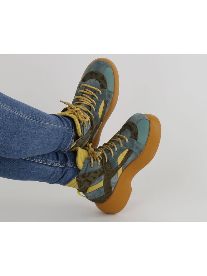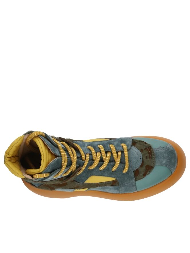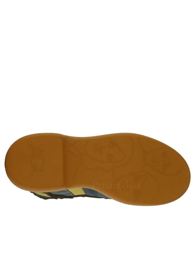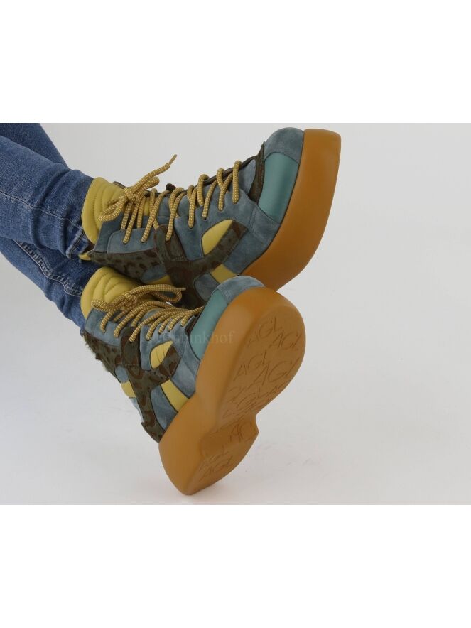Een kort veterlaarsje van AGL in een strepen patroon van leder, suède en lak leder met meerdere tinten jeansblauw, pastel geel en een panterprint met jeansblauw en cognac. Het laarsje heeft een plateauzool in de kleur camel. De binnenkant is met leder gevoerd.