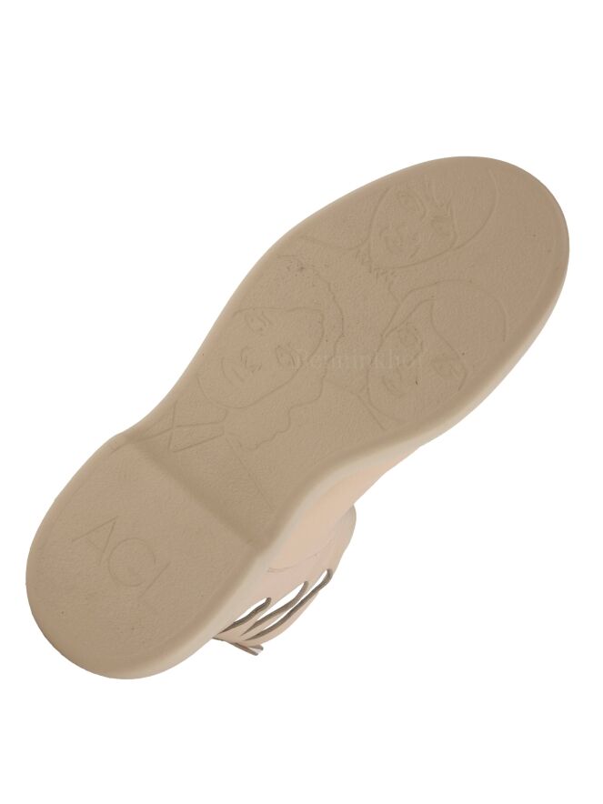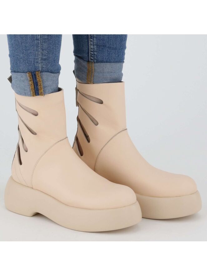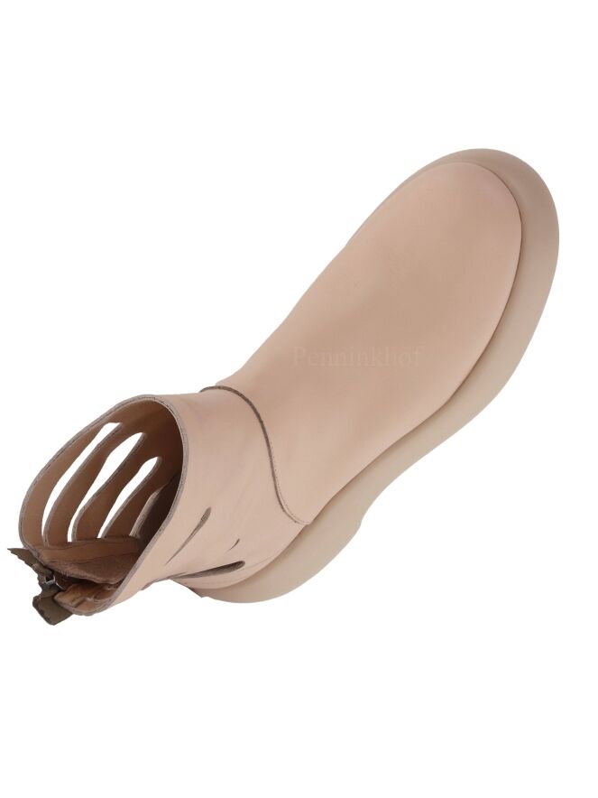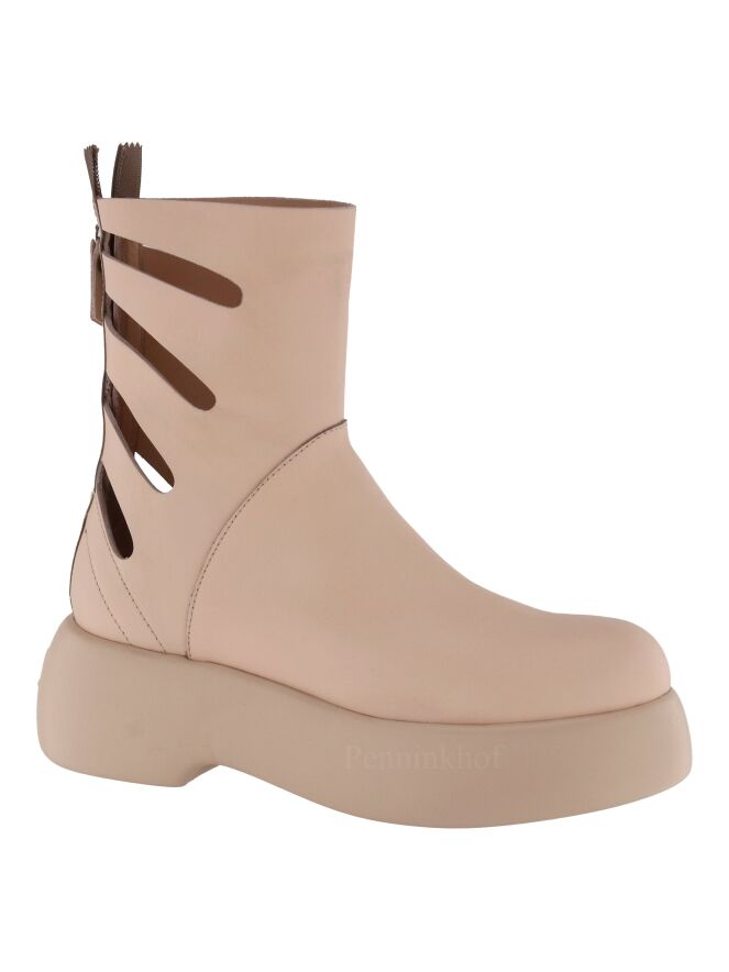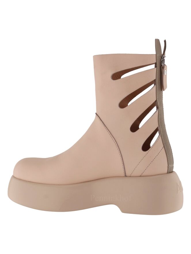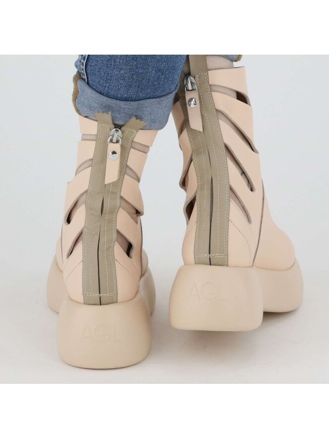 Een laarsje van AGL in de kleur nude. Het laarsje heeft een design plateauzool in een pastel nude kleur. De zijkanten van de schacht hebben langwerpige openingen. Aan de achterkant van de schacht is een rits.
