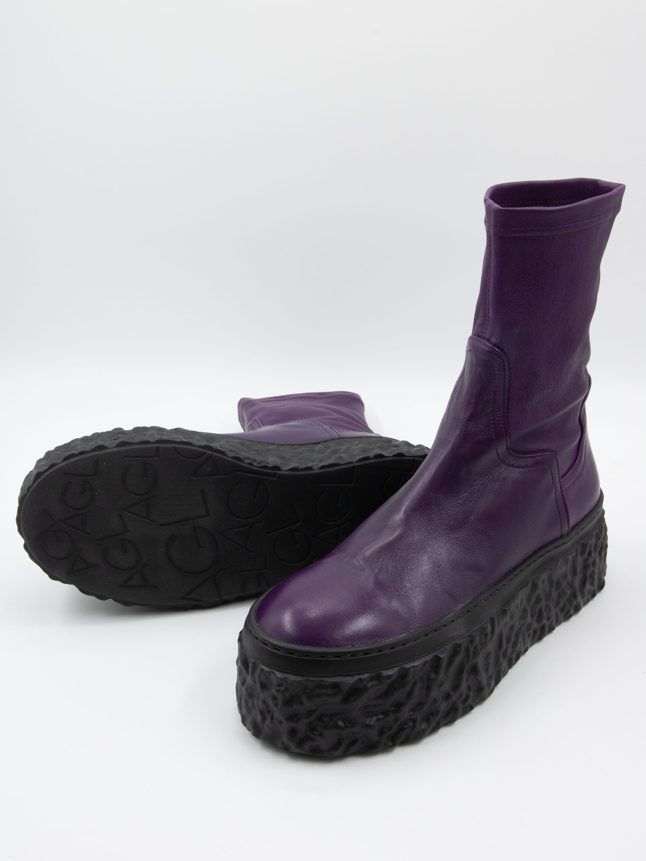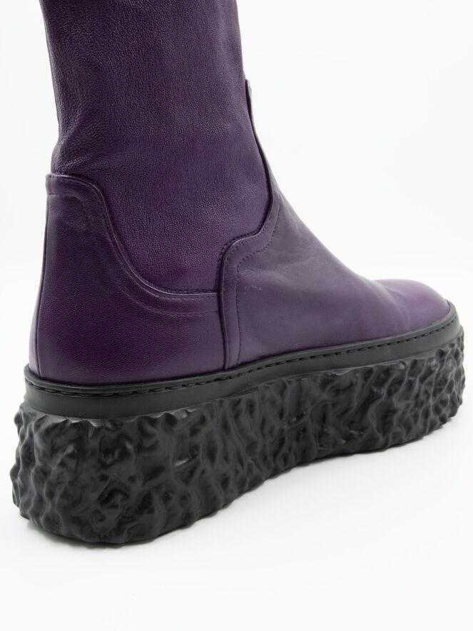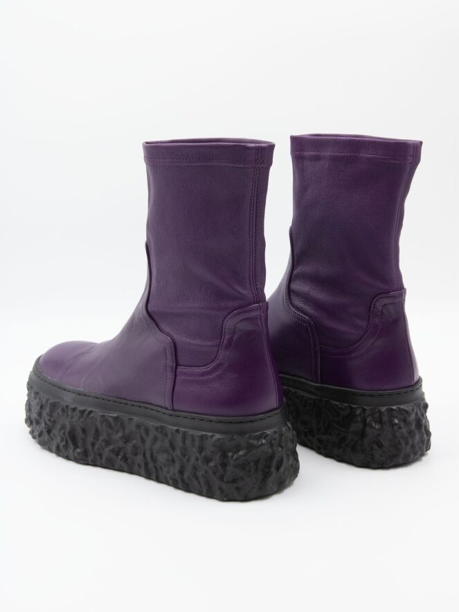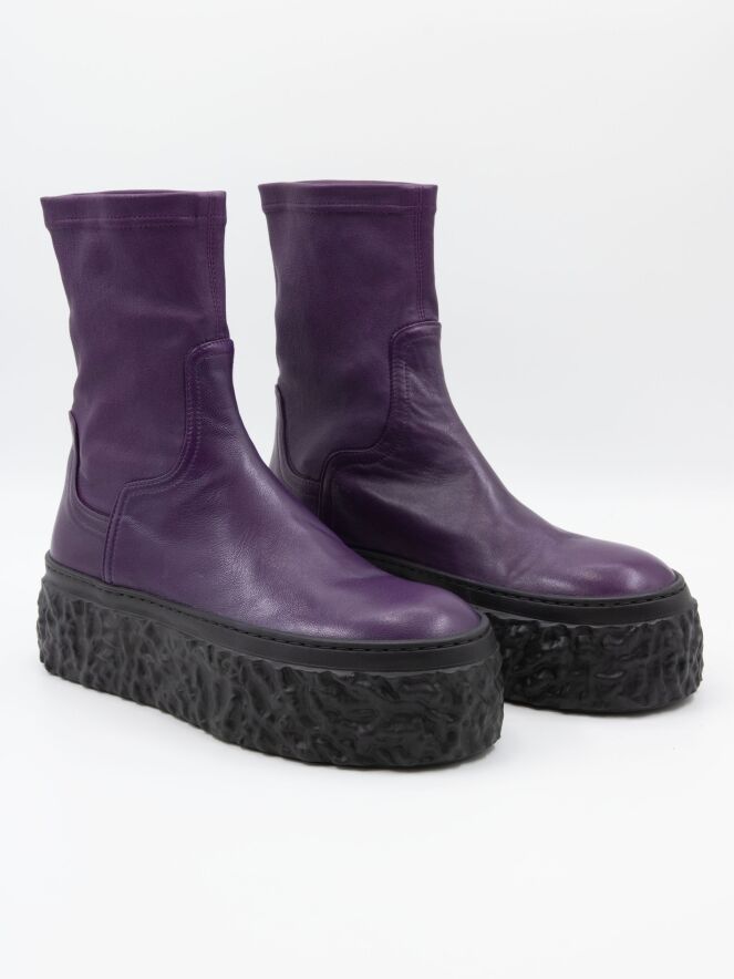 Een enkellaarsje van AGL in de kleur paars. De zwarte design plateauzool is geribbeld en oneffen. De schacht is gemaakt van imitatieleer dat stretcht en aangesloten om het been valt.