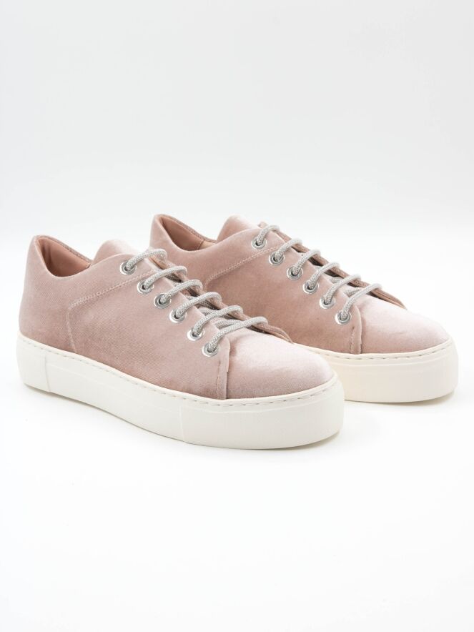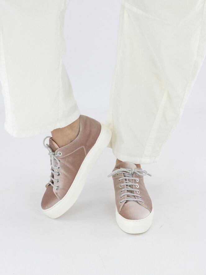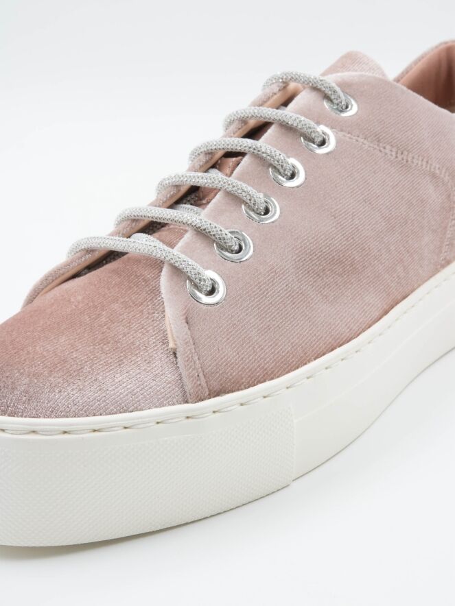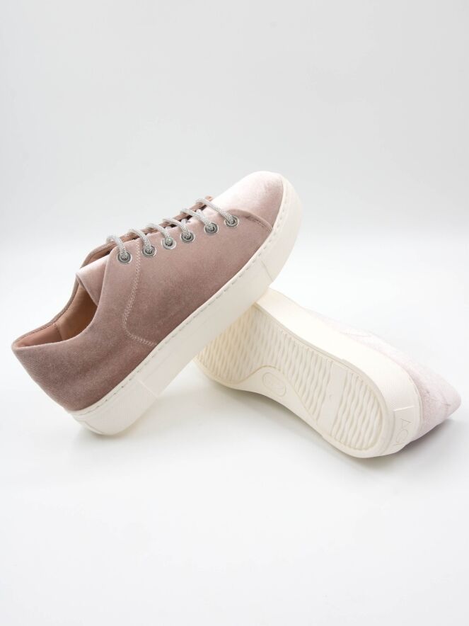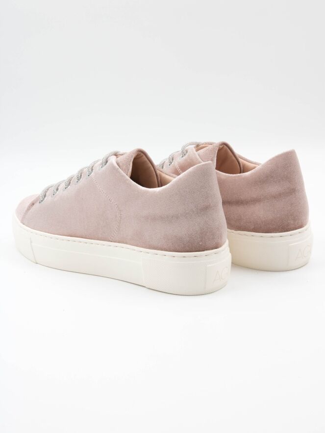 Een luxe sneaker in fluweel van AGL in de kleur roze. De veter is gemaakt met een glanzend materiaal en de vetergaatjes zijn met een metalen zilverkleurig metaal gemaakt. De plateauzool is in een lichtgrijze kleur. De binnenkant is met leder gevoerd.