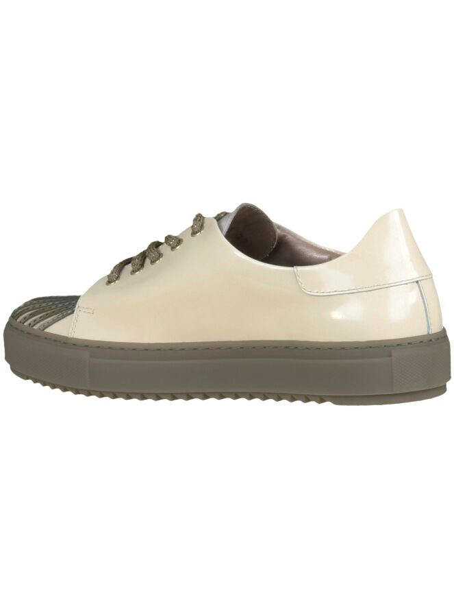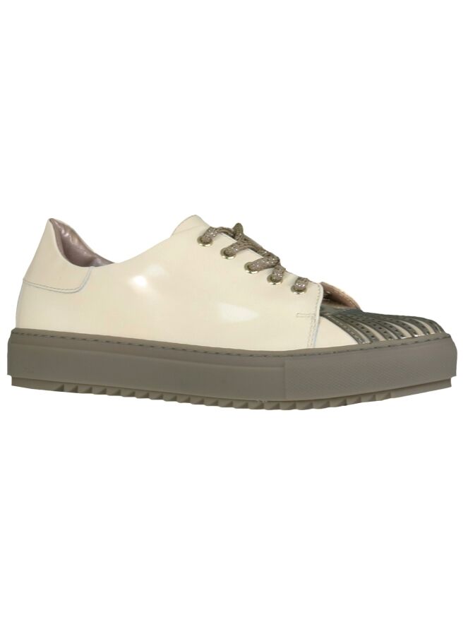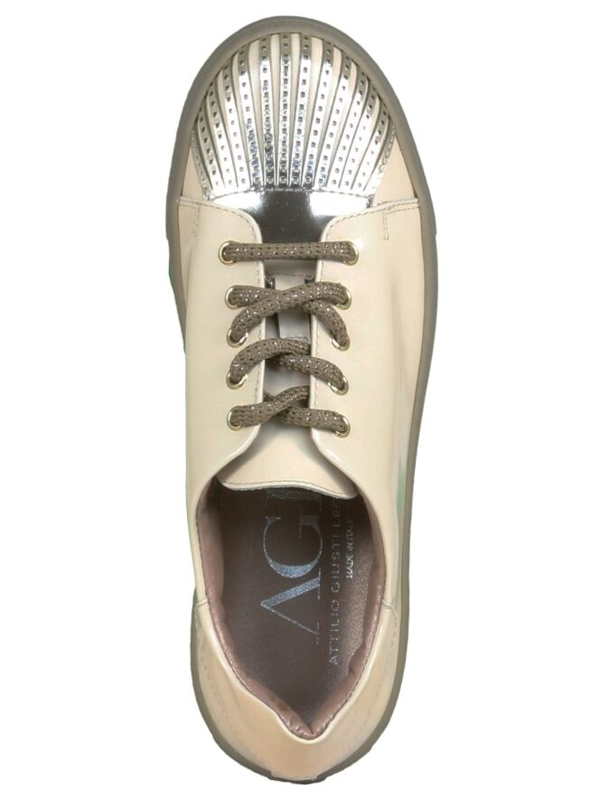Een sneaker van het merk Attilio Giusti Leombruni in de kleur beige. De sneaker is gemaakt van spazzolato leder en heeft over de neus smalle platina kleurige biesjes. De sneaker heeft een dikke taupe kleurige veter met een gouddraad er doorheen geweven. De binnenkant is met leder gevoerd en de binnenzool is uitneembaar.