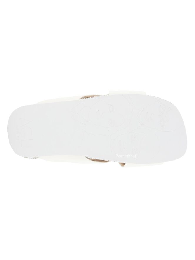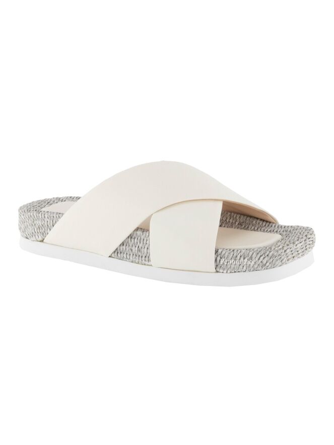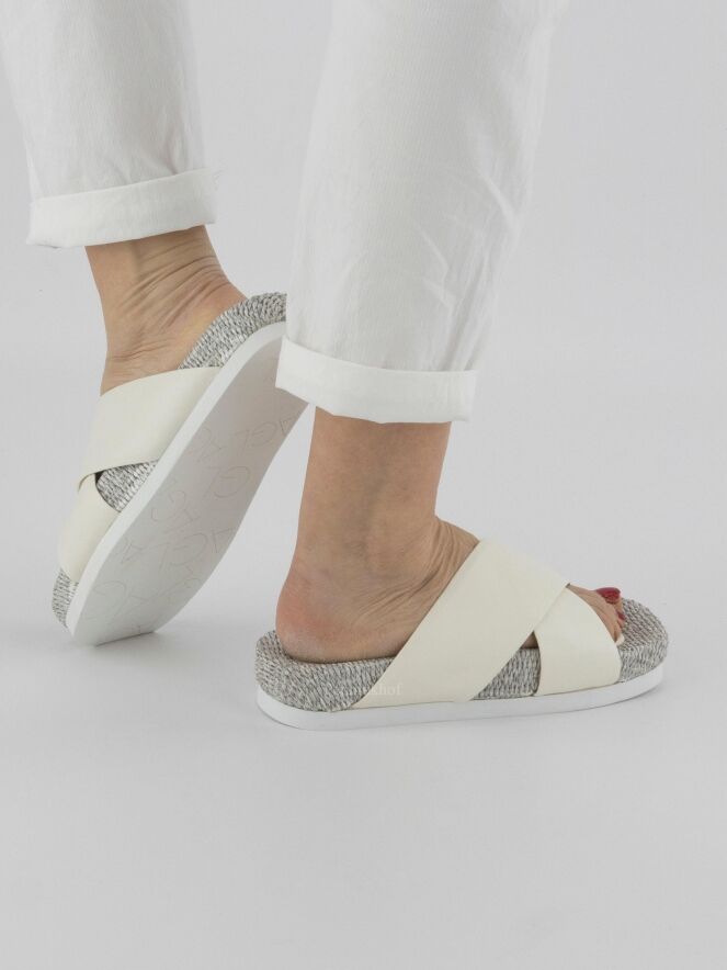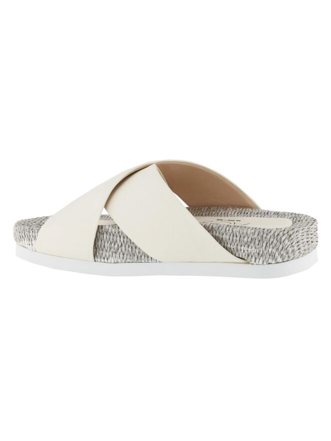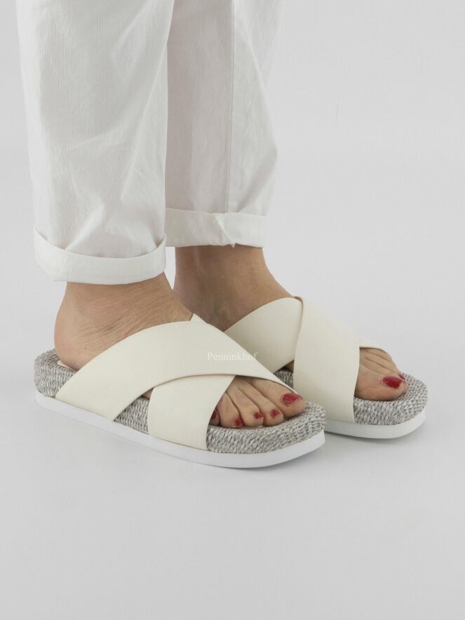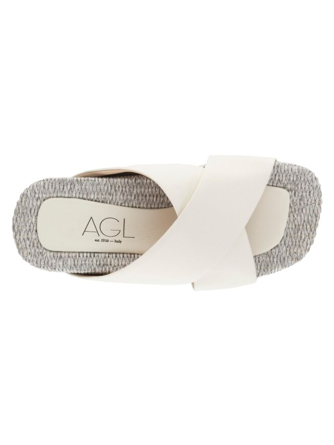 Een sandaal van AGL met gekruist leder in een roomwitte kleur. Langs het lederen centrale deel van het voetbed is dit gemaakt van gevlochten gebleekt riet.