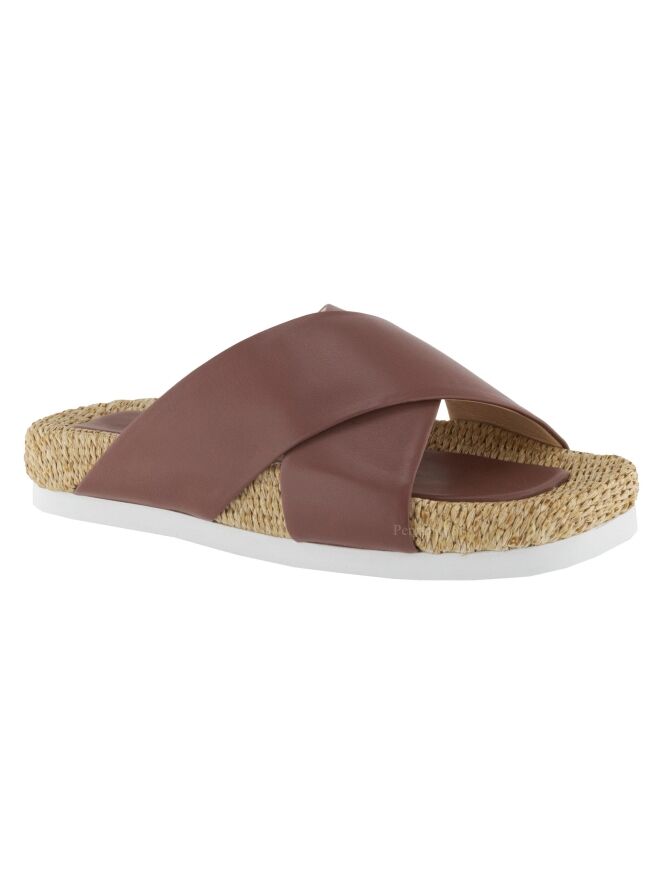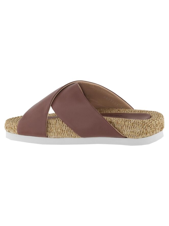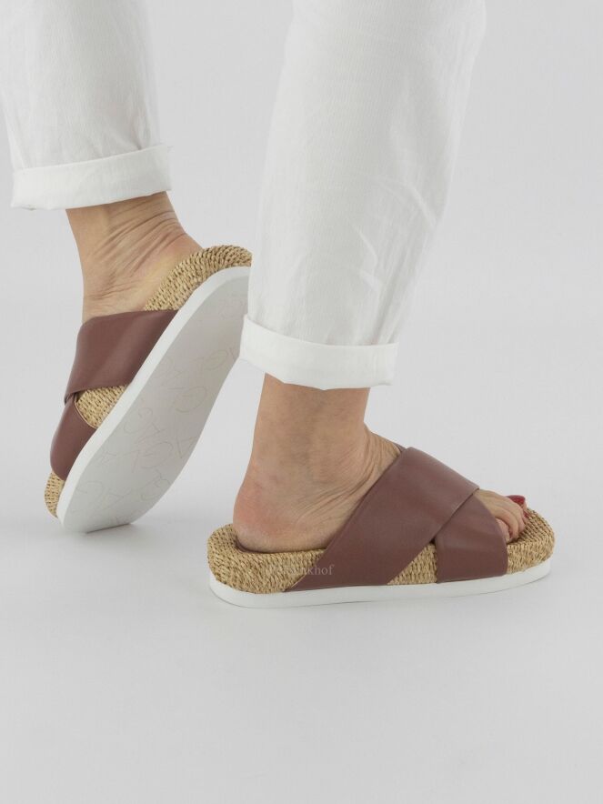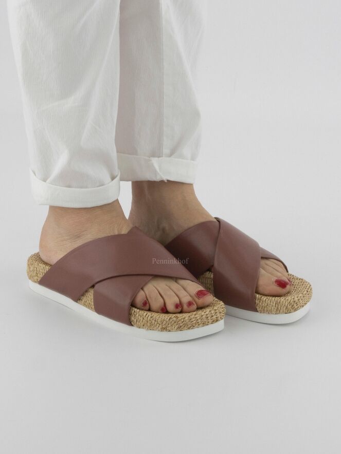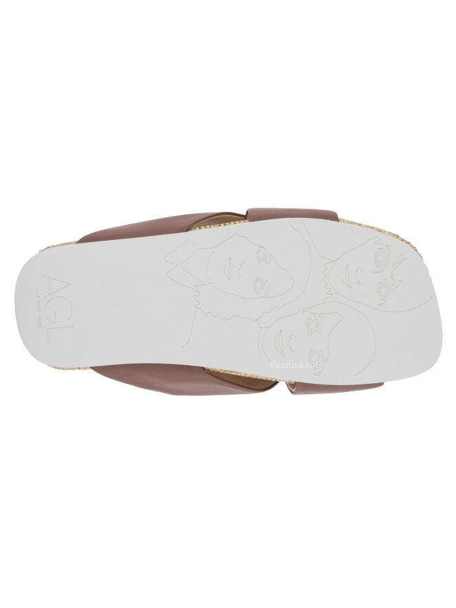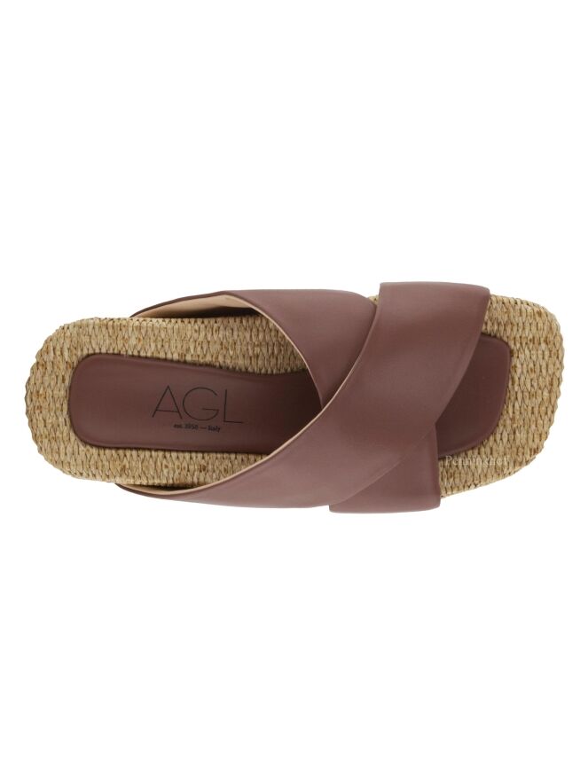 Een sandaal van AGL met gekruist leder in een bruine kleur. Langs het lederen centrale deel van het voetbed is dit gemaakt van gevlochten riet.