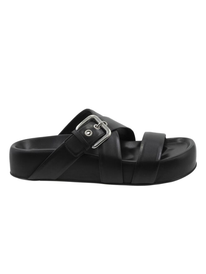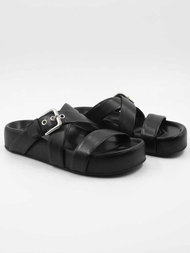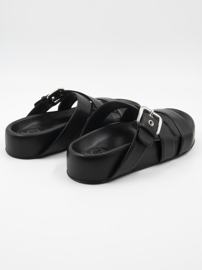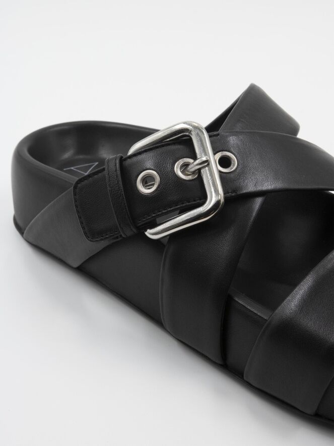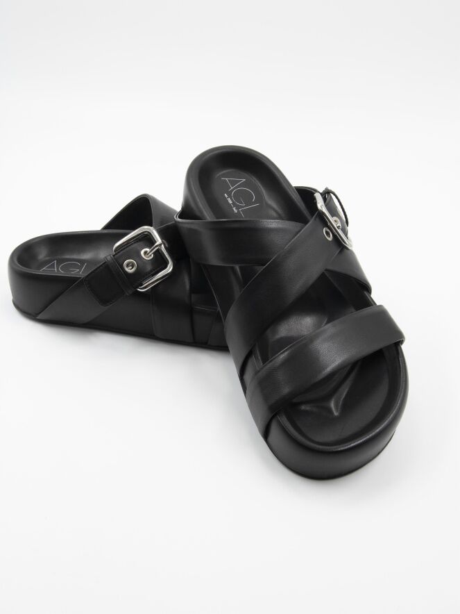 Een luxe sandaal van AGL in de kleur zwart. Over de voorvoet is een lederen band met daarvoor een gekruiste lederen ban waarvan er één verstelbaar is.