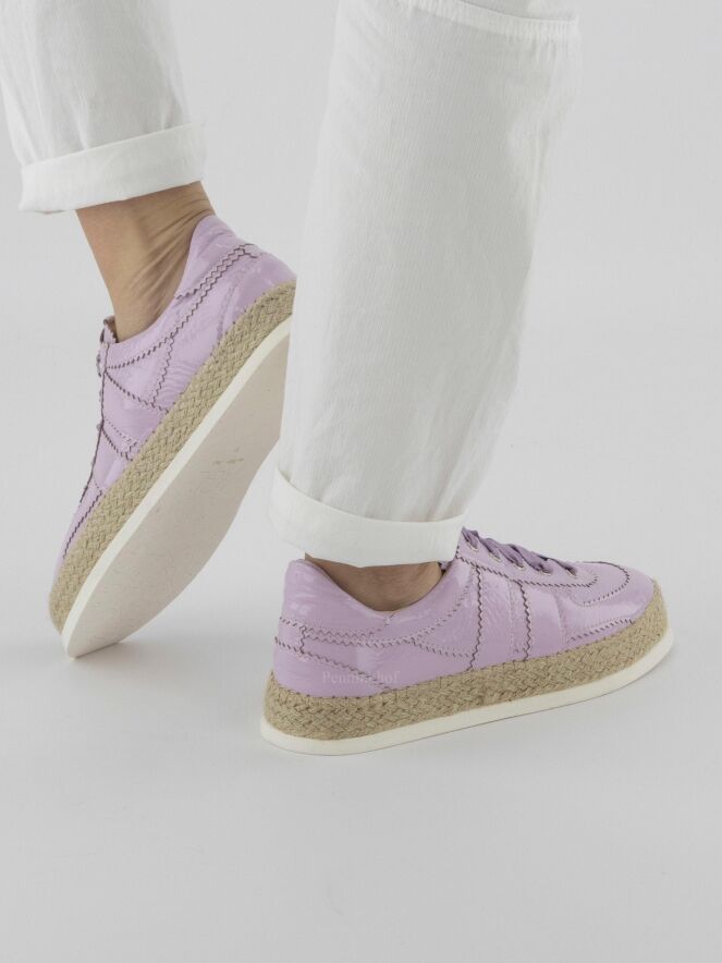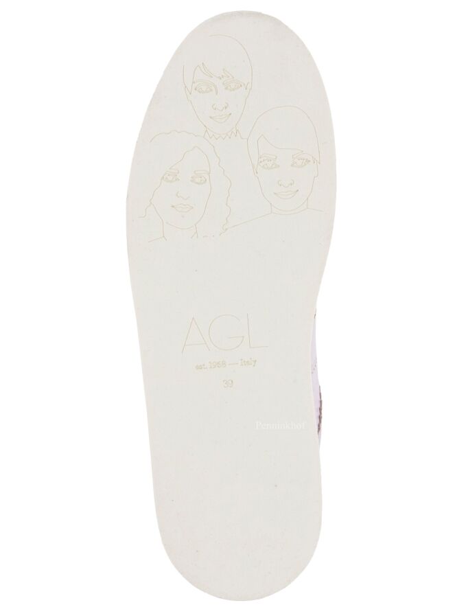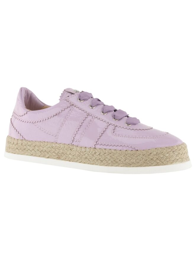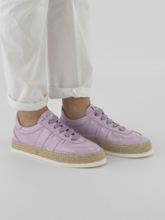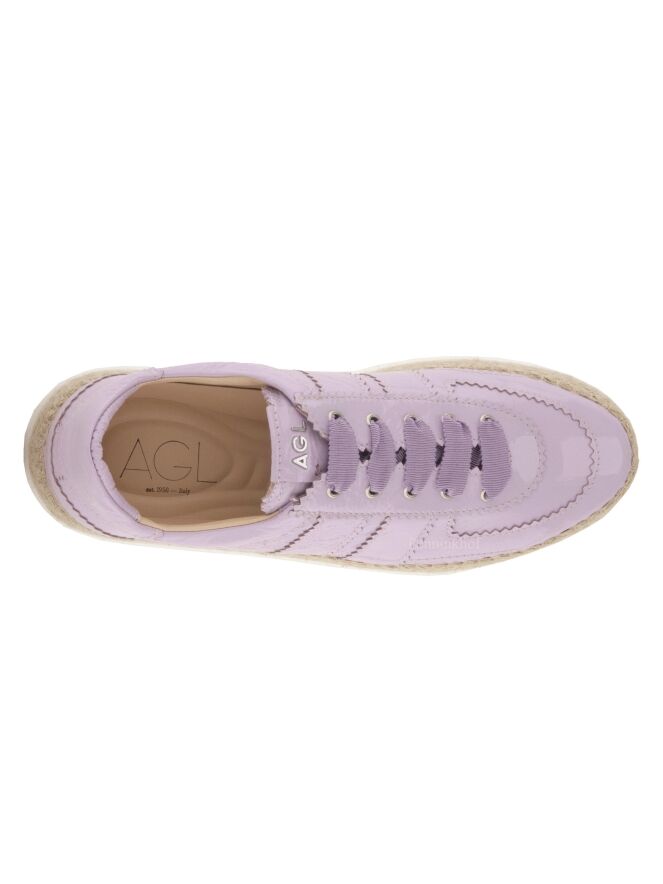 Een luxe sneaker van AGL in een zachte lila kleur. De stiknaden zijn fijn gekarteld. Vanaf de roomwitte zool is een decoratieve jute bies tot het leder. De sneaker heeft een platte fijn geribbelde veter. De binnenkant is met leder gevoerd.