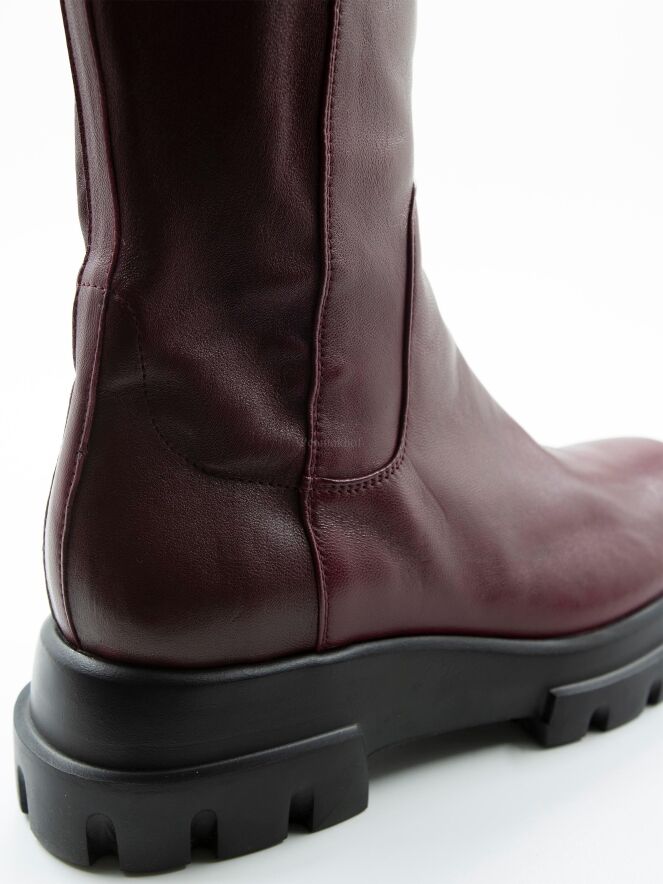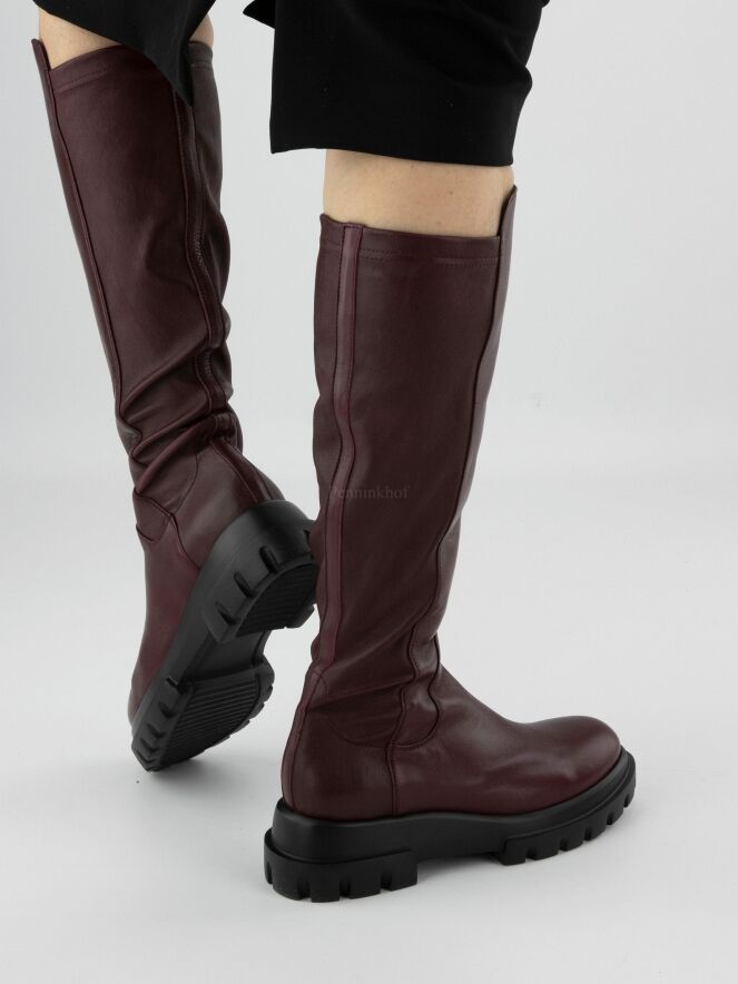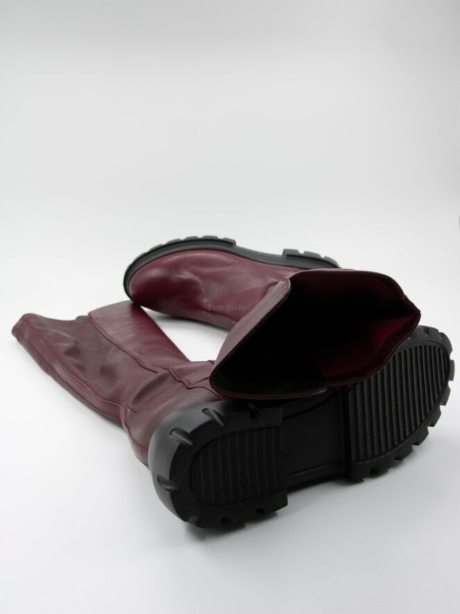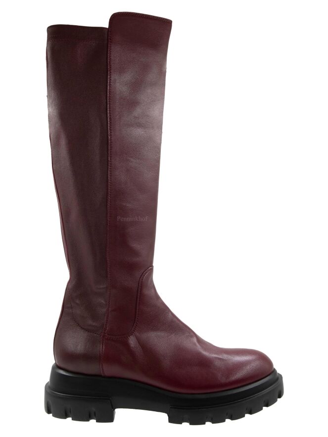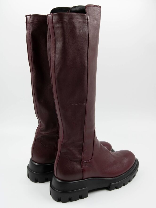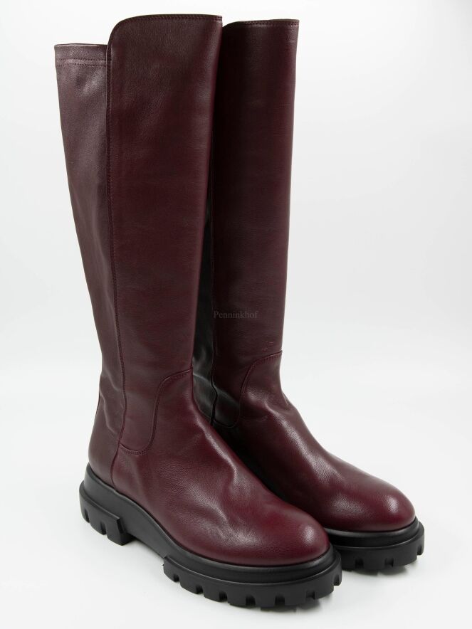 Een laars van AGL in de kleur bordeauxrood. Het laarsje heeft een ruwe zool . De achterkant van de schacht is in een zwarte elastische stof. De zwarte zool is met inkepingen. De binnenkant van de schacht is deels gevoerd met leder.
