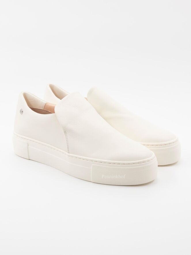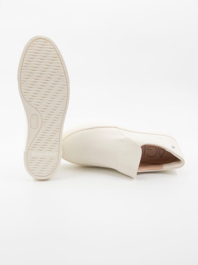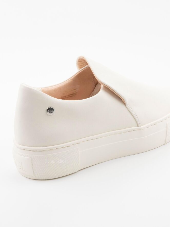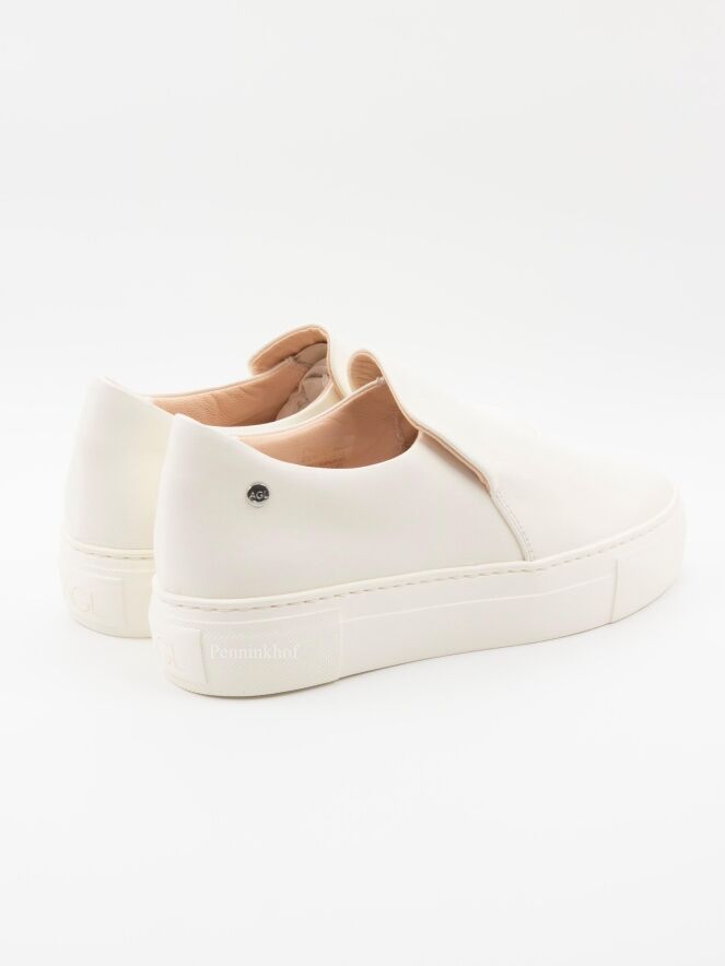 Een luxe instapper van AGL in een zacht leder in de kleur roomwit. De schoen heeft een ronde neus. De instapper heeft een plateauzool in dezelfde kleur als het leder en de binnenkant is gevoerd.