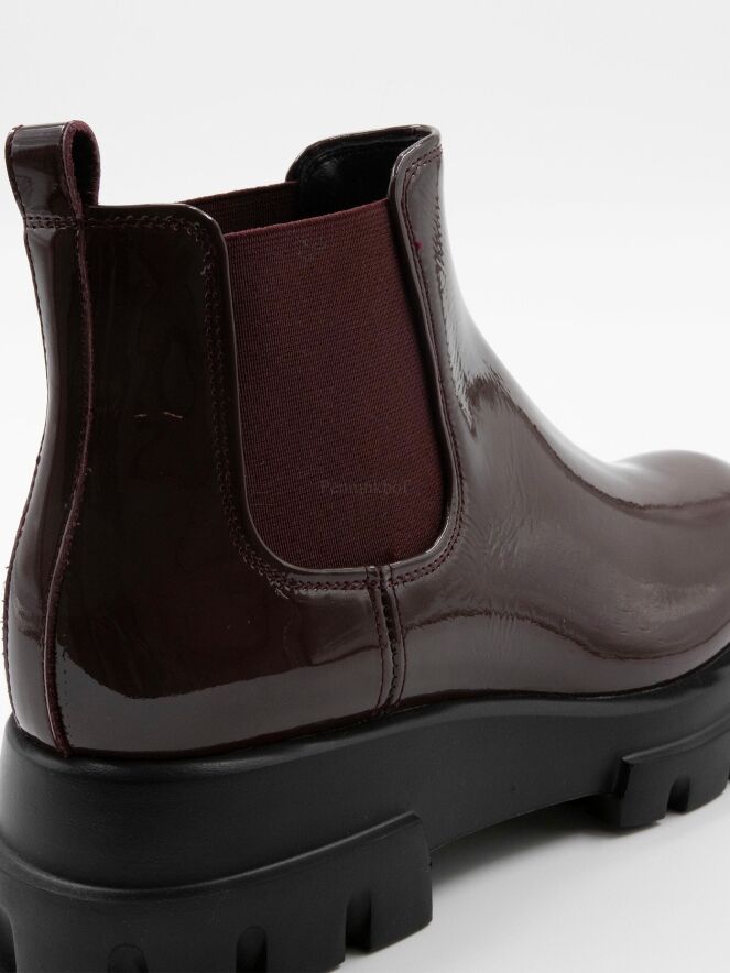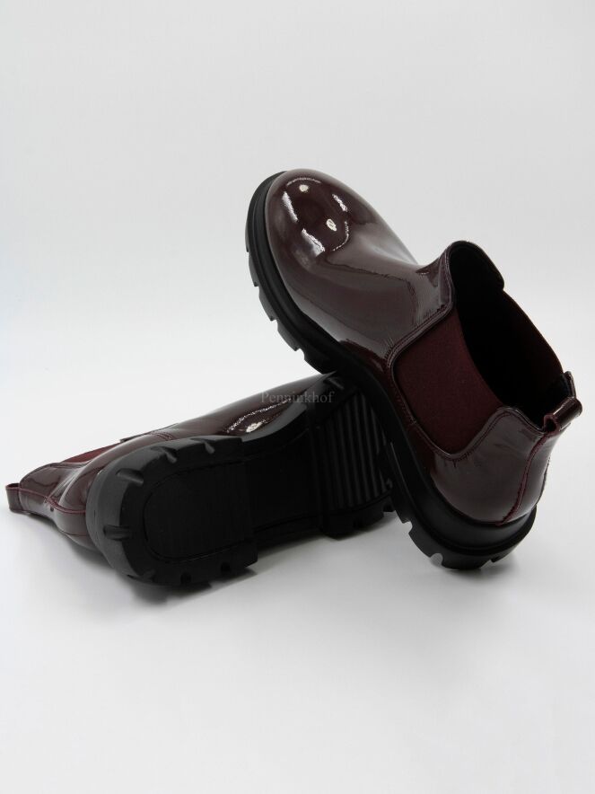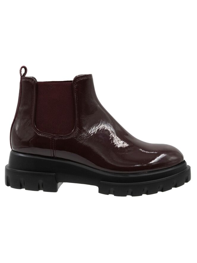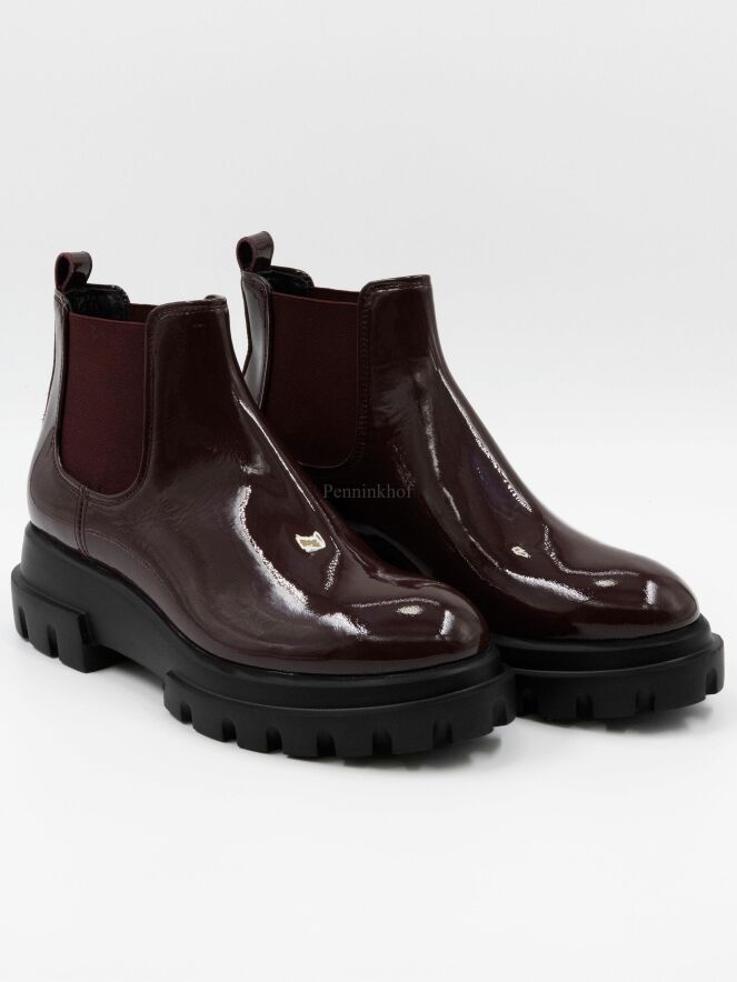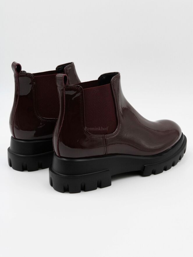 Een enkellaarsje van AGL in een bordeauxrood lakleder. De elastische stof aan beide zijkanten is in een kleur van het lakleder. De zwarte zool heeft decoratieve inkepingen.