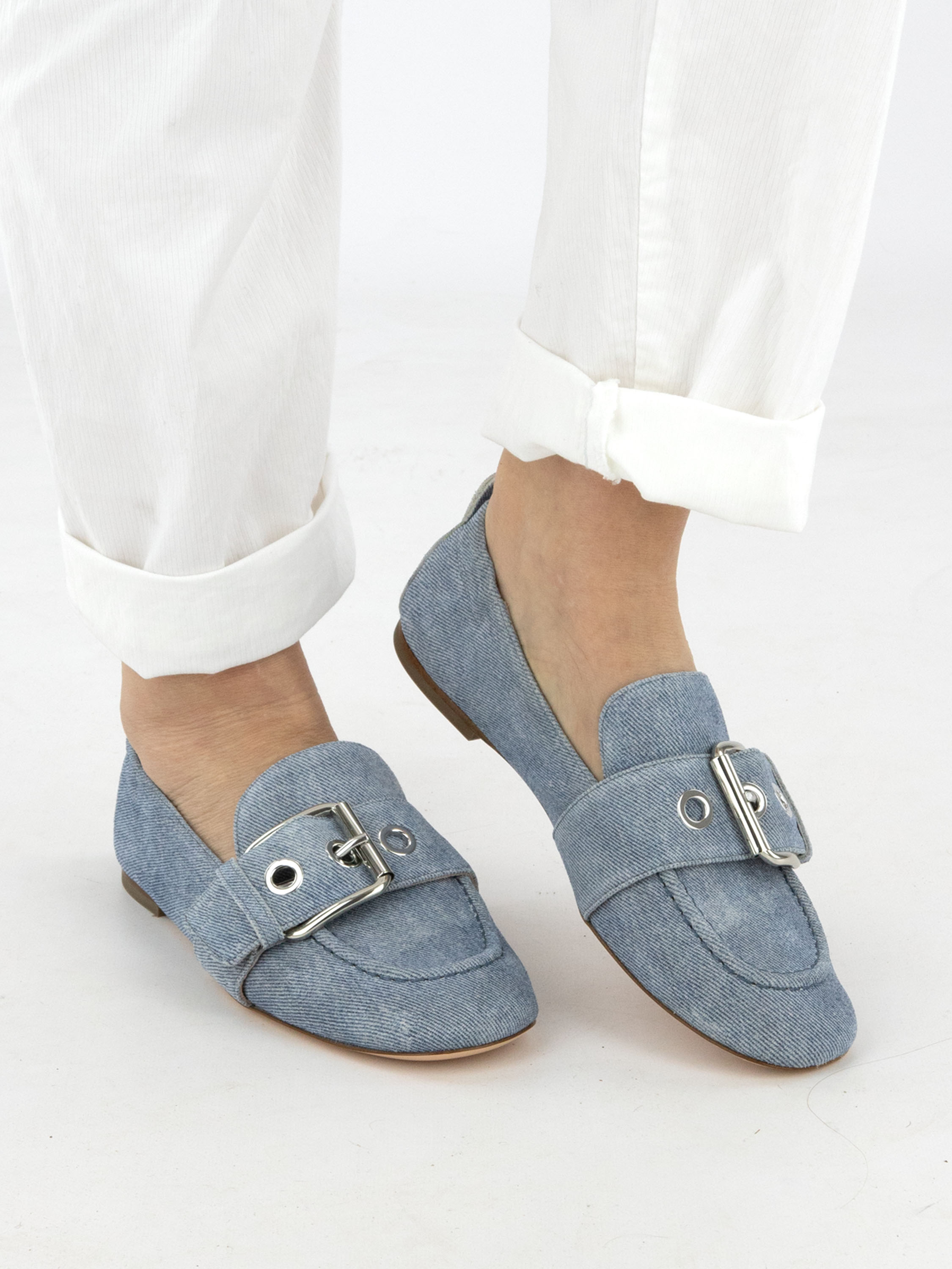 Een instapper van AGL (Attilio Giusti Leombruni) uitgevoerd in jeanssuède in gemêleerde jeanskleuren met wit. Over de voorvoet loopt een brede band met een decoratieve grote zilverkleurige gesp. De instapper is aan de binnenzijde met leer gevoerd.