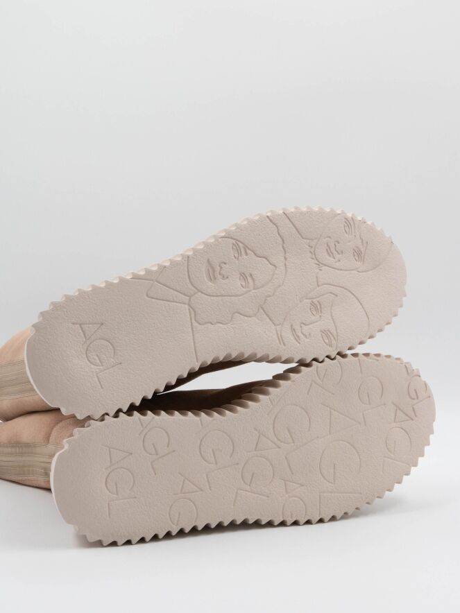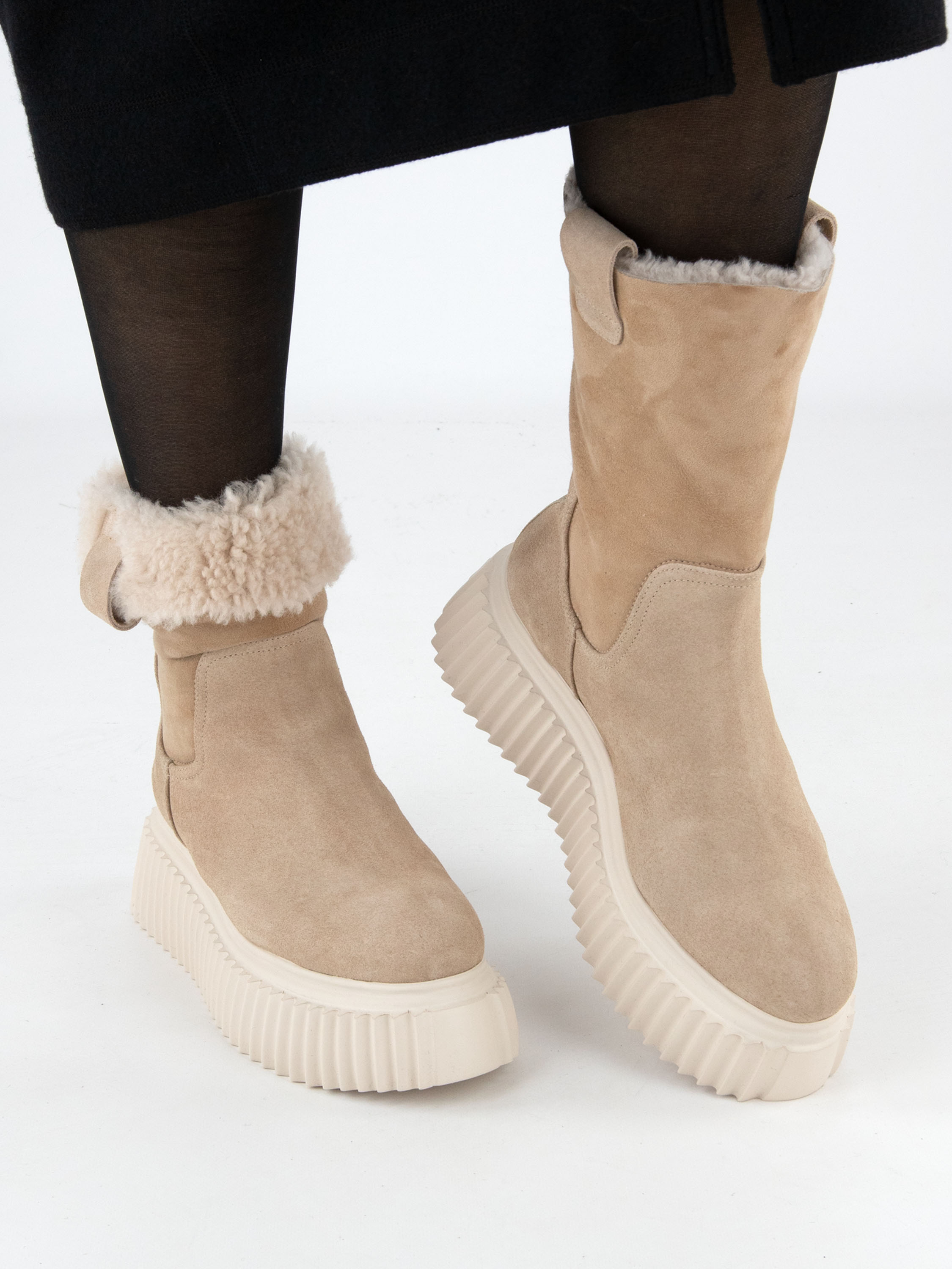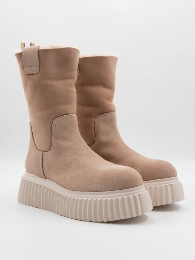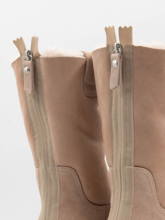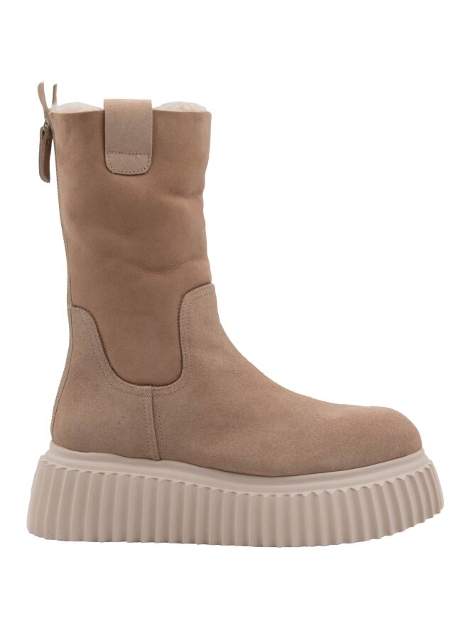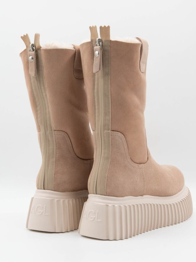 Een halfhoog laarsje van AGL in beige. De soepele schacht is uitgevoerd in zacht suède en aan de binnenzijde gevoerd met curly vacht voor extra warmte en comfort. Het laarsje staat op een design plateauzool met een gekartelde afwerking. Aan de achterzijde van de schacht bevindt zich een rits voor gemakkelijk aan- en uittrekken.