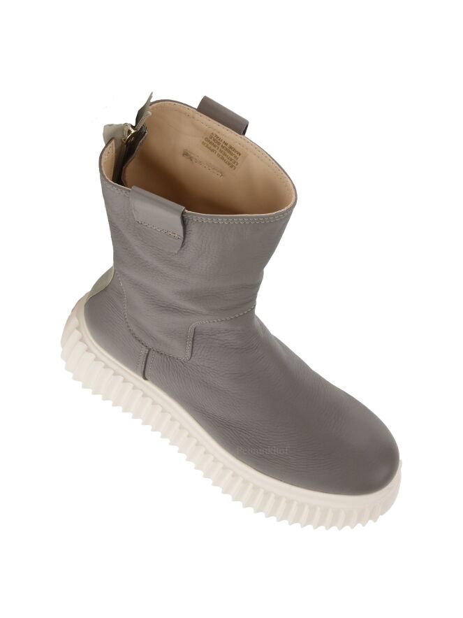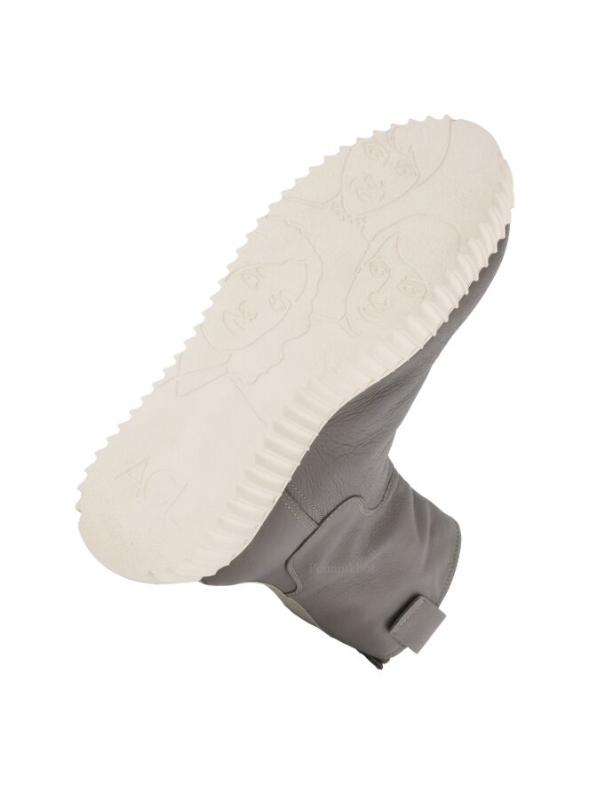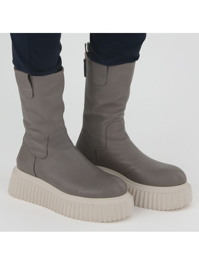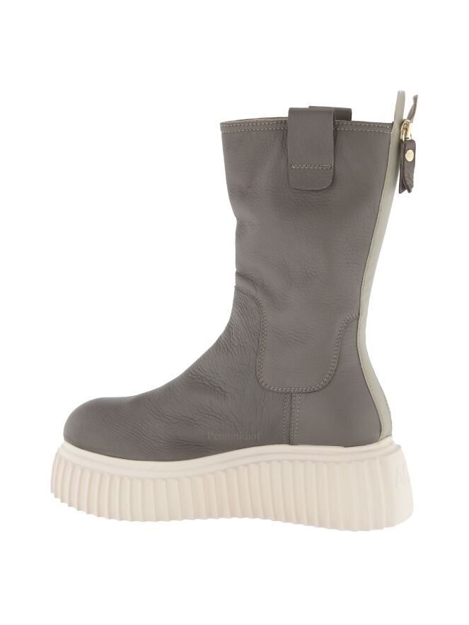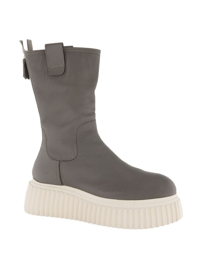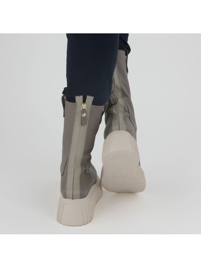 Een half hoog laarsje van AGL in de kleur grijs. Het laarsje heeft een geribbelde roomwitte design plateauzool. Aan de achterzijde van de schacht is een verborgen ritssluiting. De binnenkant is met leder gevoerd.