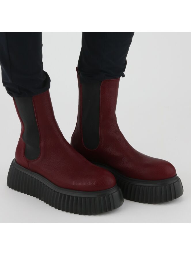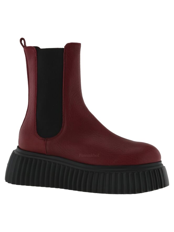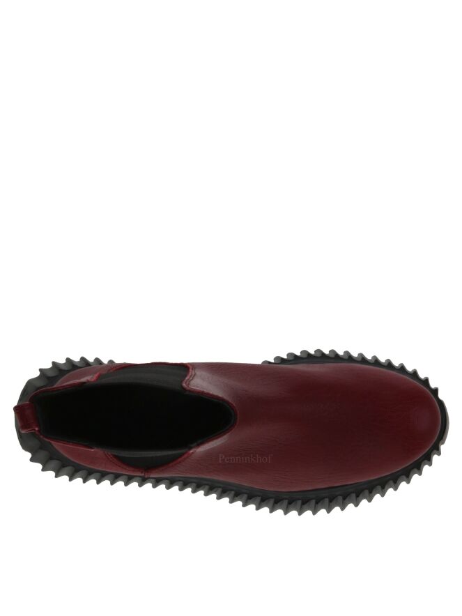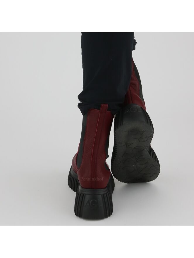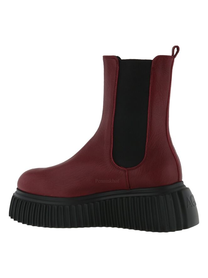 Een kort laarsje van AGL in de kleur rood. Het laarsje is van zacht leder met aan beide zijkanten van de schacht elastiek. De design zool is gekarteld.