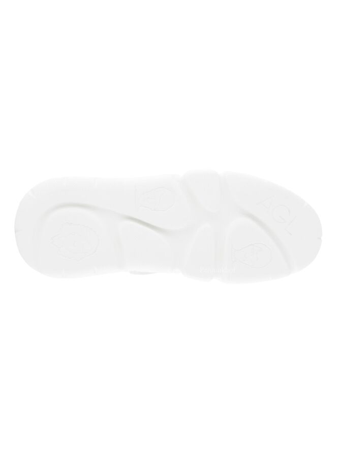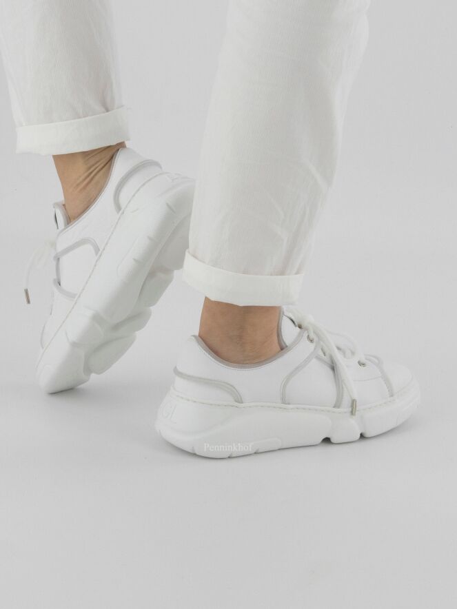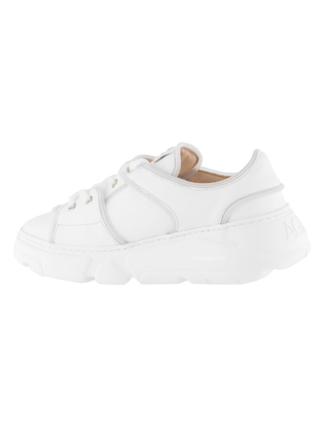 Een sneaker van AGL in de kleur wit. Langs de naden is een decoratieve matte kunststof bies. De veters zijn omwikkeld met een transparant gaas. De binnenzijde is gevoerd met leder.