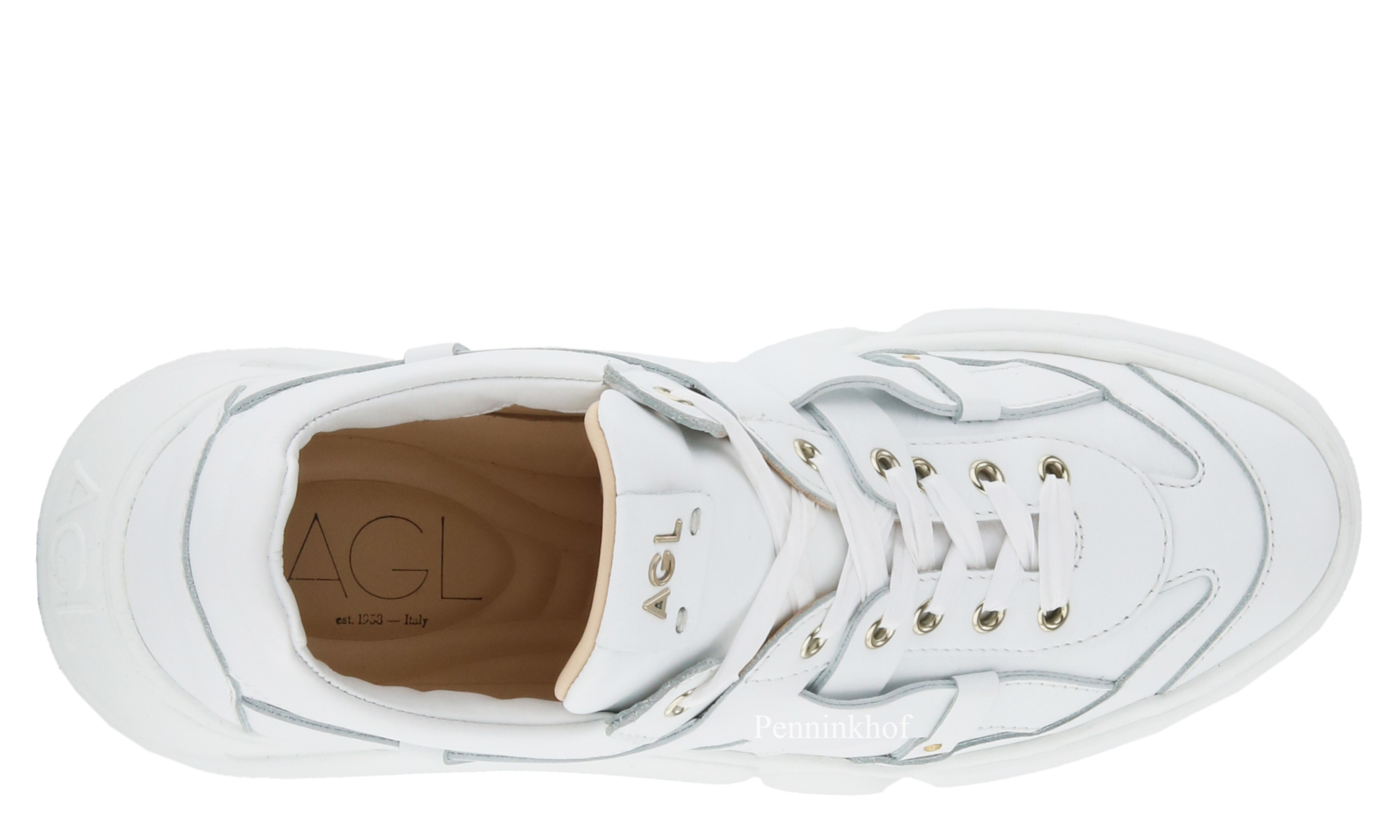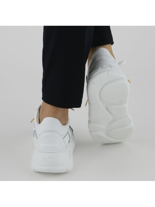 Een sneaker van AGL in de kleur wit. De sneaker is decoratief gevlochten. De veters zijn in een witte mat satijnen stof. De sneaker heeft een design zool en de binnenkant is met leder gevoerd.