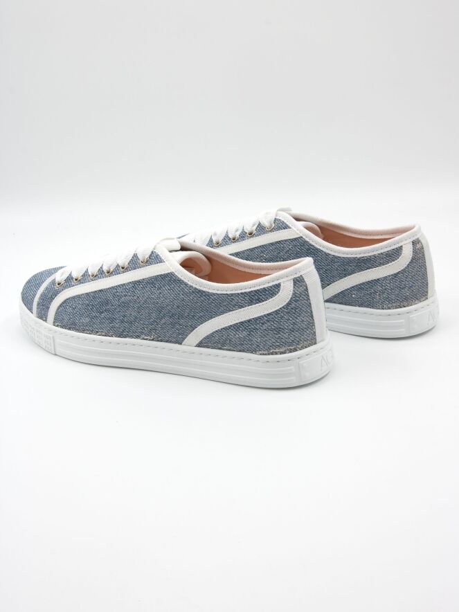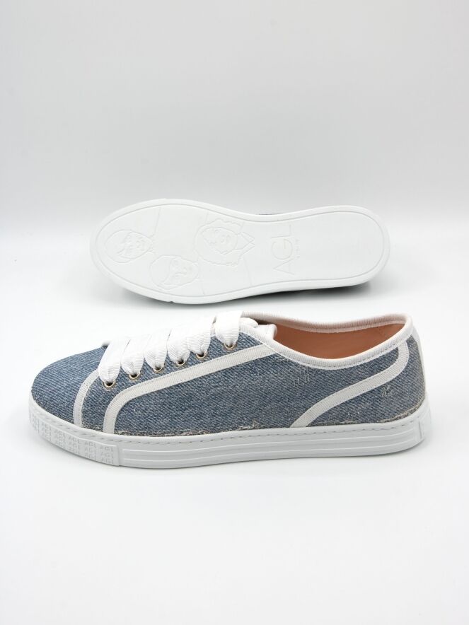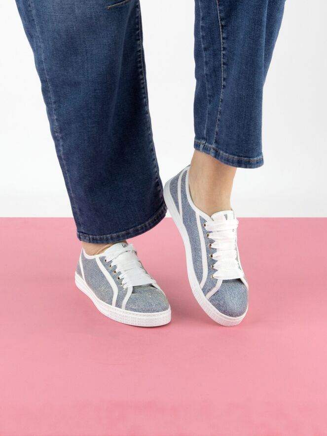 Een lage sneaker van AGL in een velourstof in de kleur jeans. Over de voorvoet loopt een brede band. De sneaker heeft een witte zool en de binnenkant is met leder gevoerd.