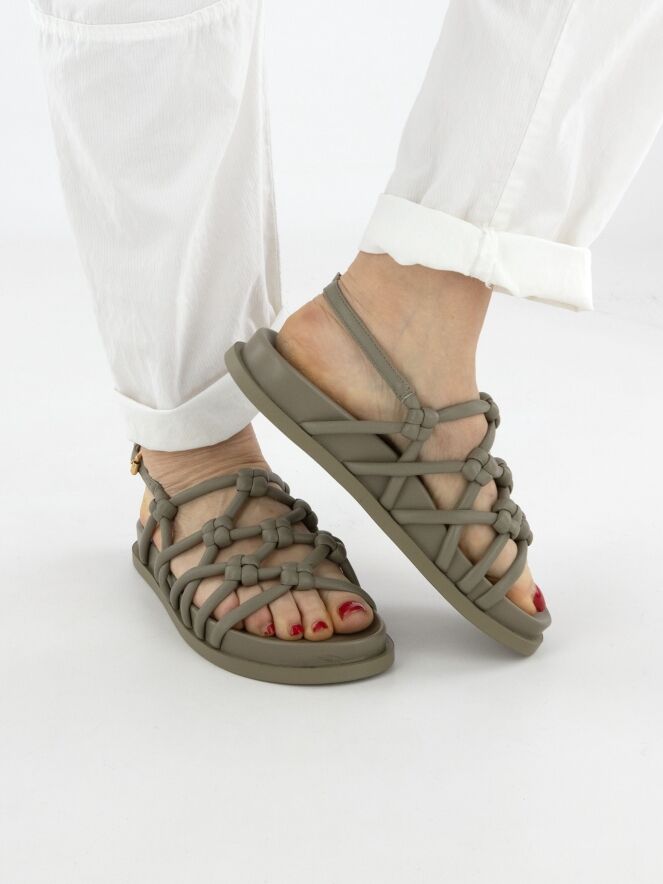 Sandaal van AGL in kruislings gevlochten leder in een elegante olijfgroene tint. Het verstelbare hielbandje zorgt voor een comfortabele en perfecte pasvorm.