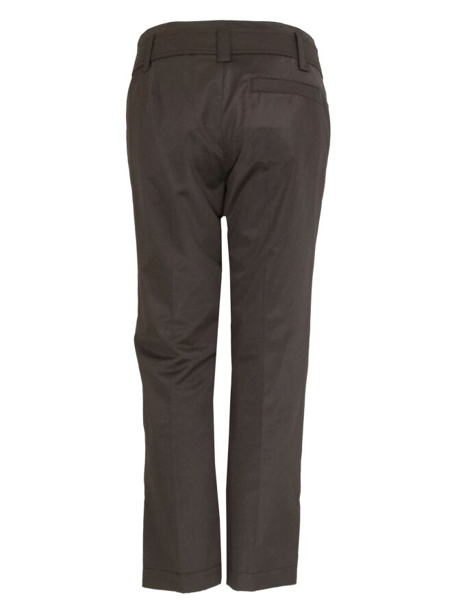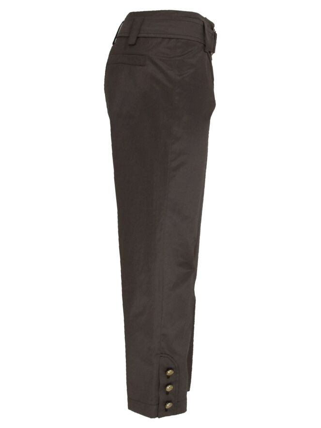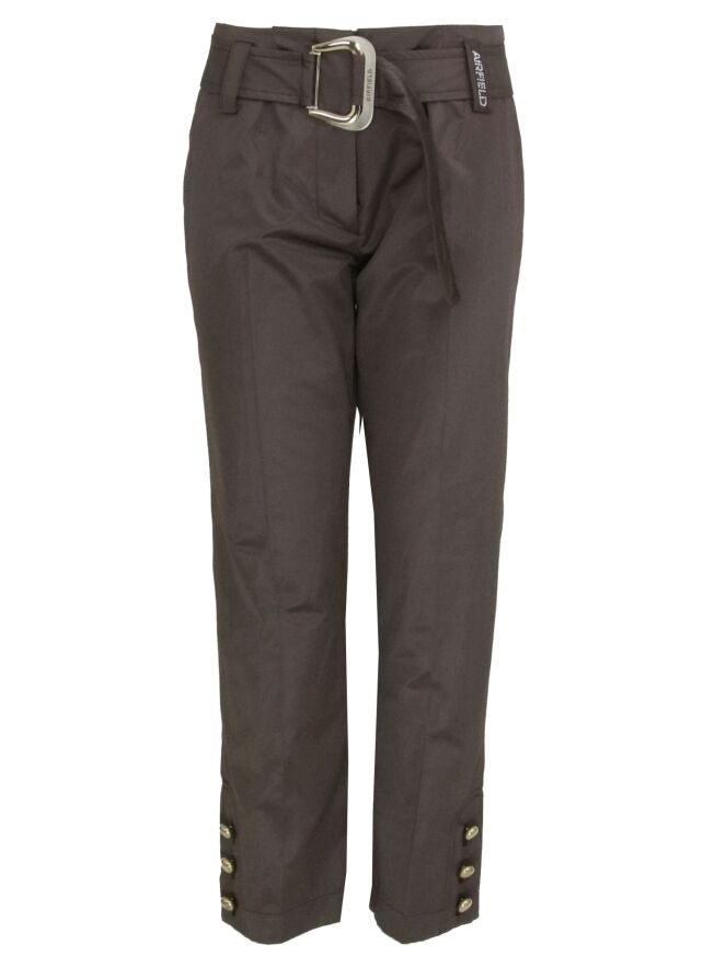 Een broek van Airfield in een mat glanzende kleur bruin. De broek heeft een ceintuur in dezelfde stof als de broek met een grote goud kleurige gesp. Aan de onderkant van de pijpen zijn 3 goudkleurige knopen. Deze broek mag op 30 graden worden gewassen.