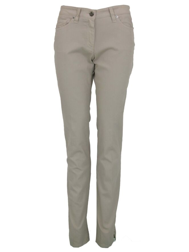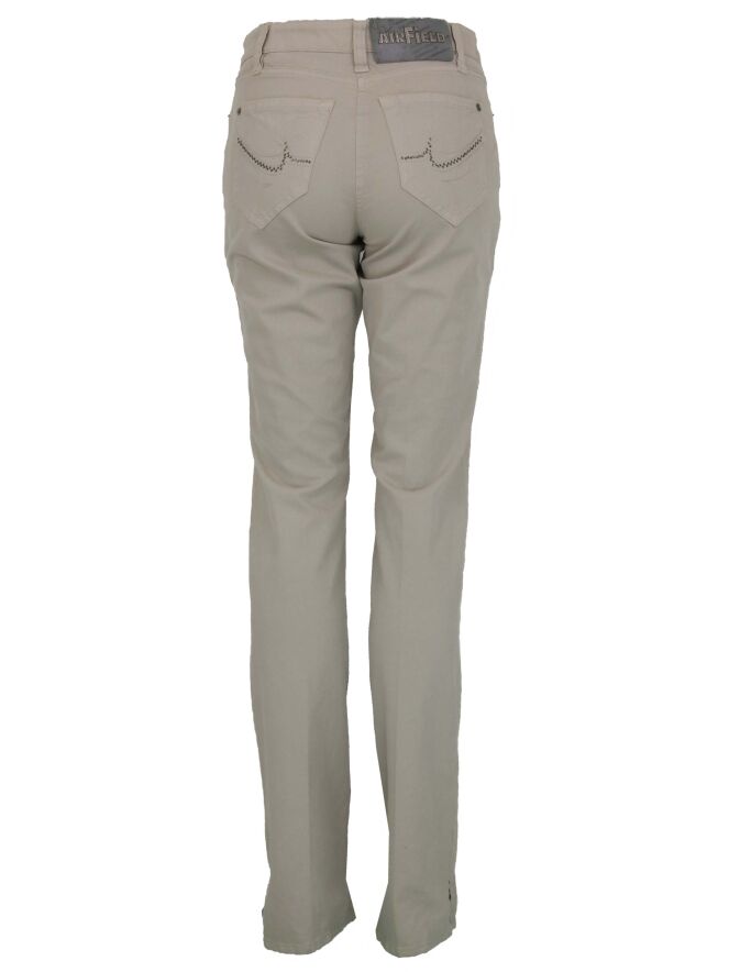 Een broek van Airfield in de kleur beige. De broek is in een 5 pocket model. Op de achterzakken zijn fijne strassteentjes. Deze broek mag op 30 graden worden gewassen.