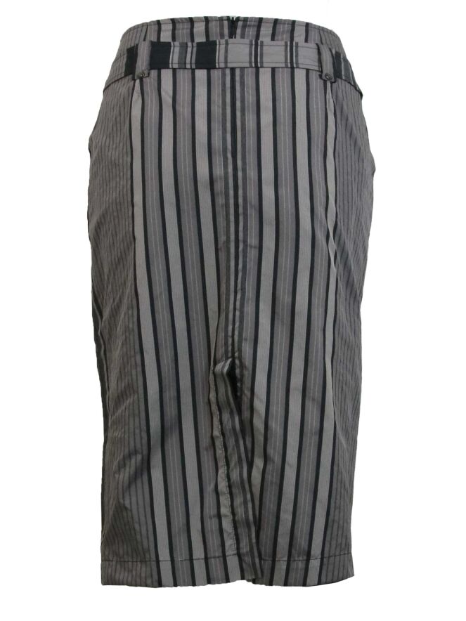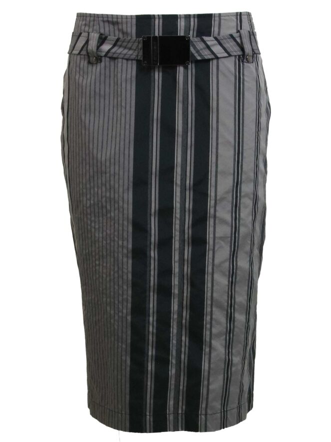 Een rok van Airfield in een strepen patroon met meerdere tinten grijs en zwart. De rok heeft een hoge taille met een ceintuur in dezelfde stof als de rok met een rechthoekige nikkelkleurige gesp. De rok van over de knie en is ongevoerd. Deze rok mag op 30 graden worden gewassen.