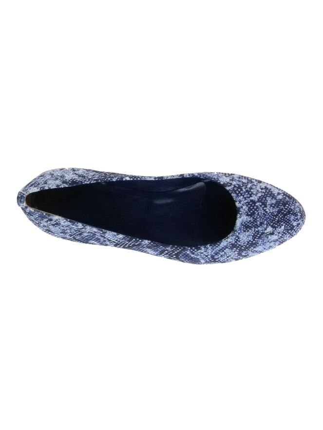 Een ballerina van Alba Teci in een print met meerdere tinten blauw. De ballerina heeft een ronde neus en een houten hakje. De binnenkant is met leder gevoerd.