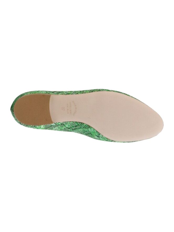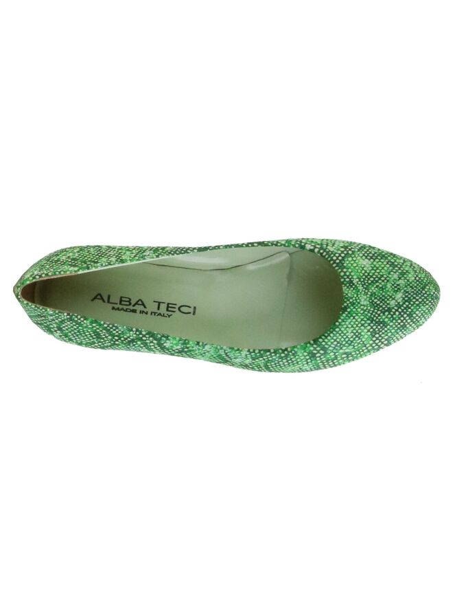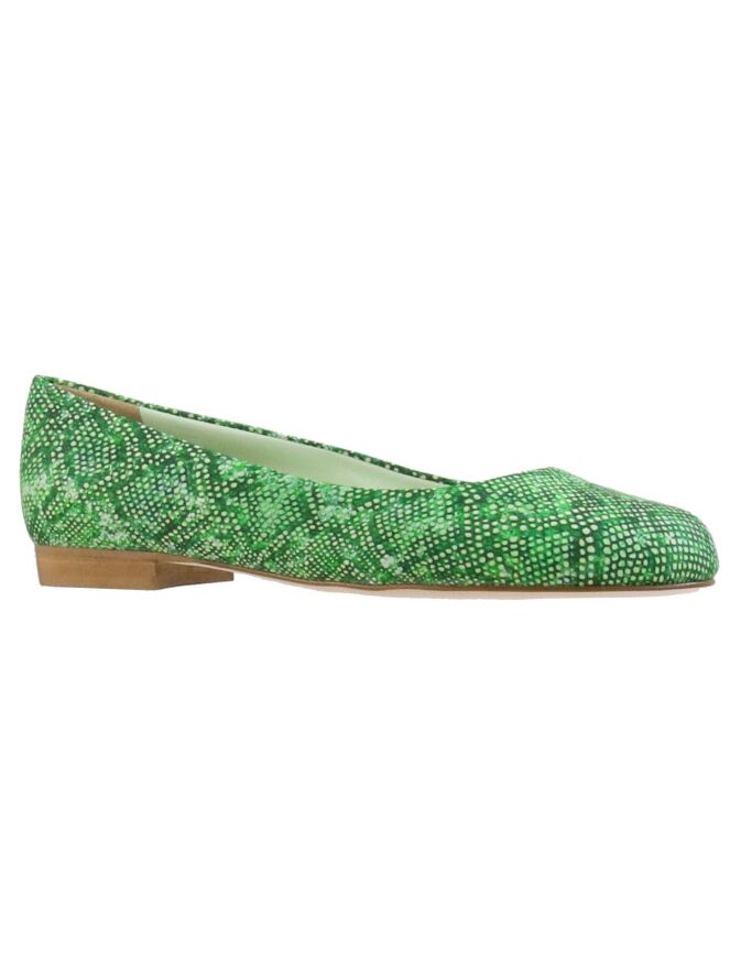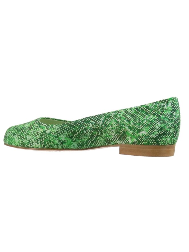 Een ballerina van Alba Teci in een print met meerdere tinten groen. De ballerina heeft een ronde neus en een houten hakje. De binnenkant is met leder gevoerd.