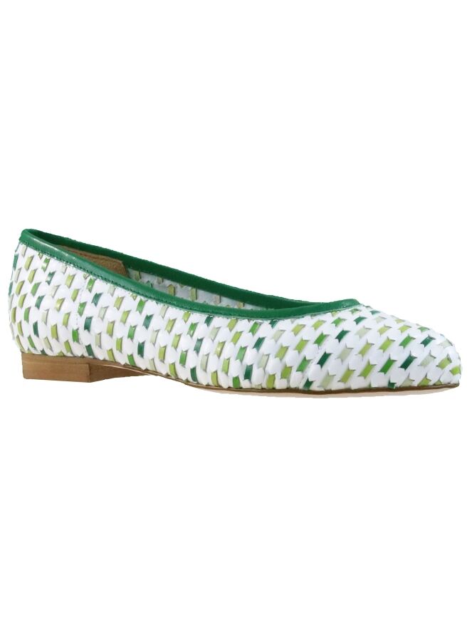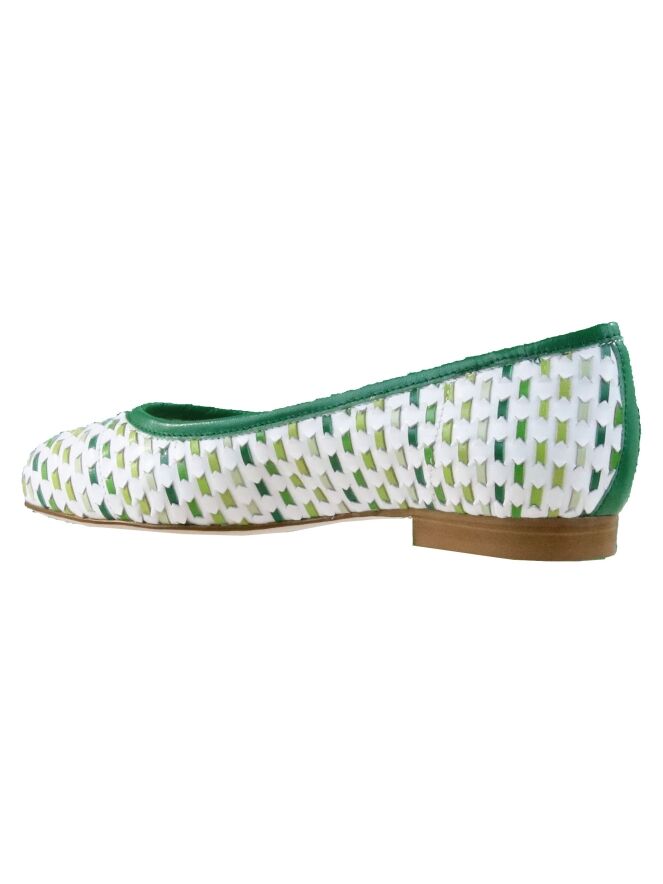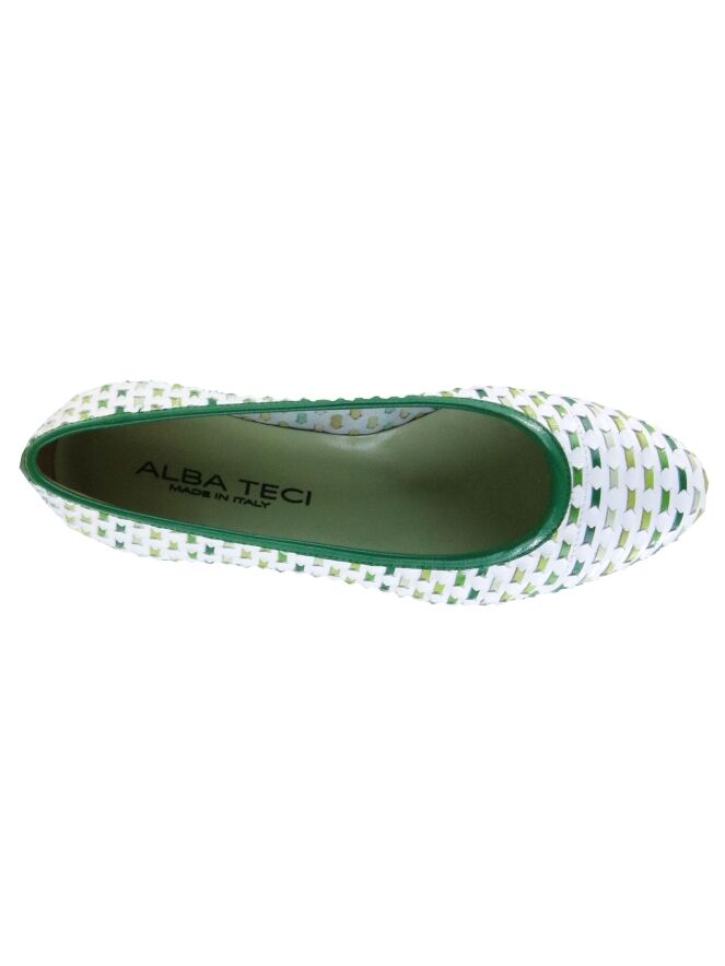 Een ballerina van Alba Teci met meerdere tinten groen op een witte basiskleur. De gekleurde lederen linten zijn door het basis leder gevlochten. Langs de rand en op de hiel is een groene bies. De binnenkant is niet gevoerd.
