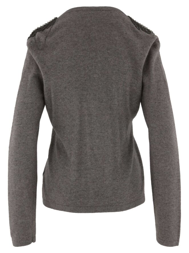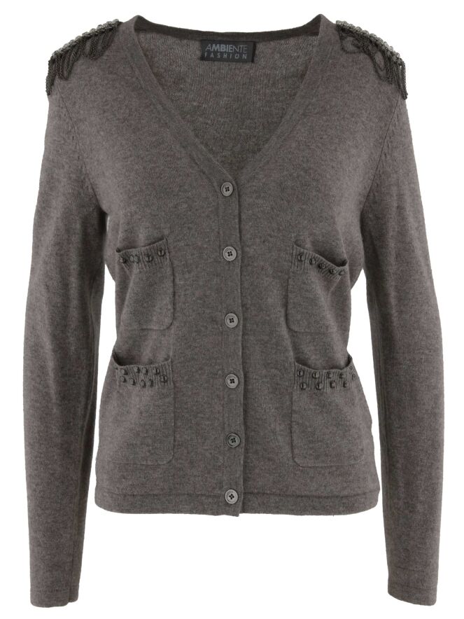 Een gemêleerd vest van Ambiente in de kleur taupe. Op de schouders zijn decoratieve pailletten met strassteentjes, studs en messing kleurige kettinkjes. Aan de voorzijde zijn 4 zakken met decoratieve studs. Dit vest mag op de hand worden gewassen.