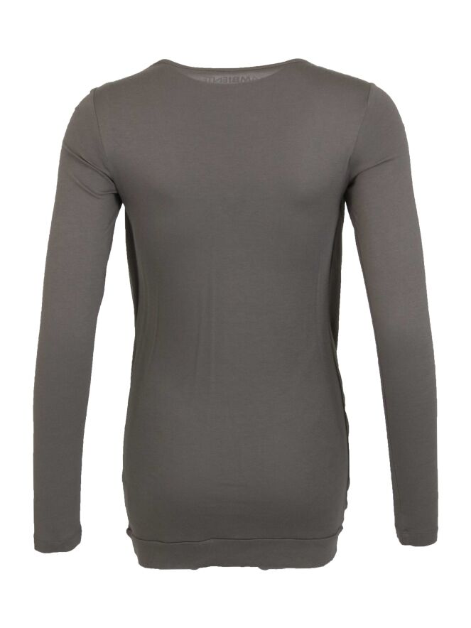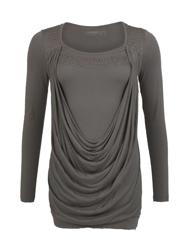 Een lang shirt van Ambiente in de kleur taupe. Het shirt heeft aan de voorzijde een dubbele stof waarvan de bovenste stof vanaf de zijkanten van de buste in een drapeer effect valt. Aan de voorzijde zijn bij de schouders en onder de ronde hals decoratieve studs. Dit shirt mag op de hand worden gewassen.