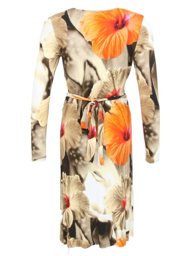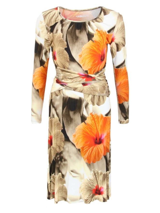 Een jurk van Ambiente in een bloemenprint met de kleuren oranje, roomwit en meerdere tinten bruin. In de taille zijn vanuit de zijkanten 2 geplooide linten als ceintuur. Langs de rand van de ronde hals is de stof fijn geplooid. Deze jurk mag op de hand worden gewassen.