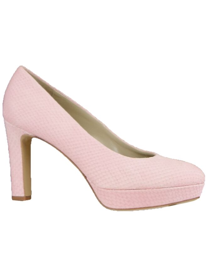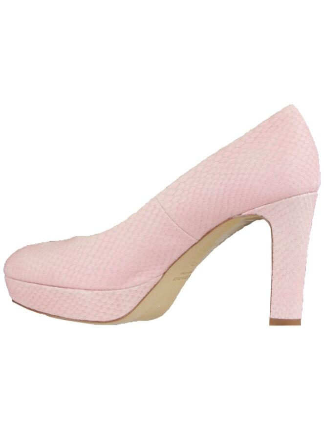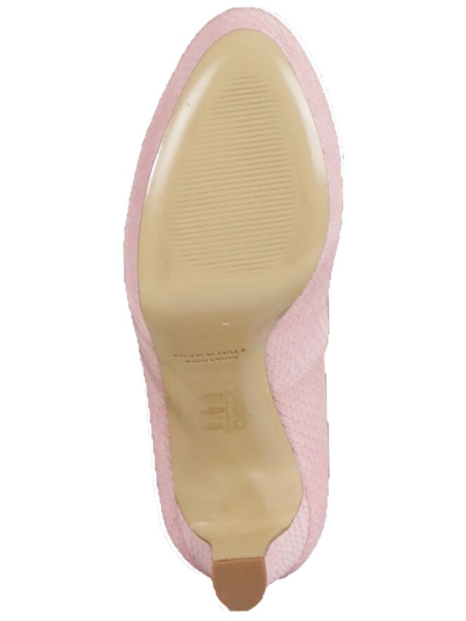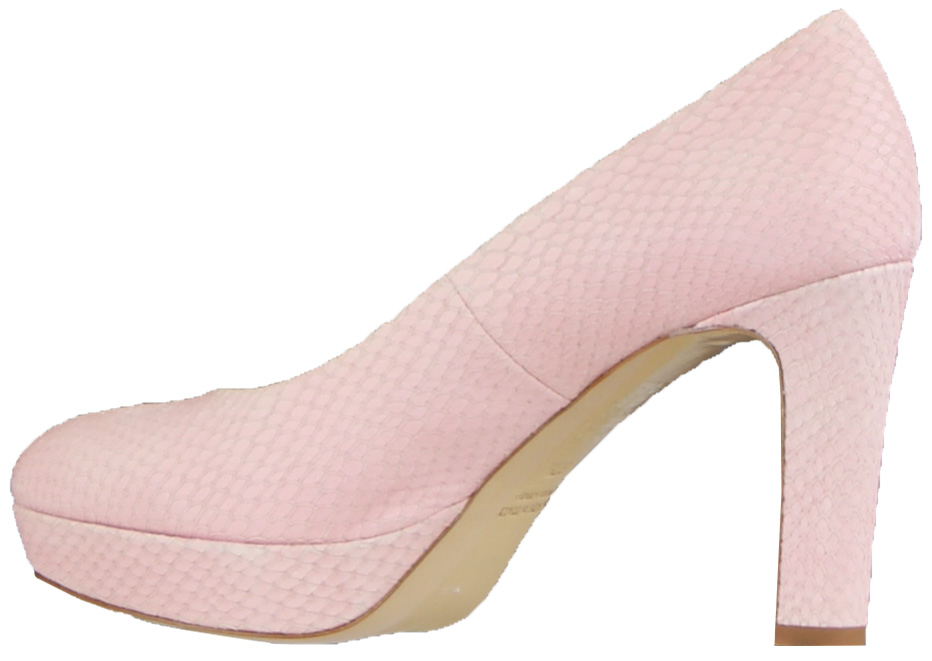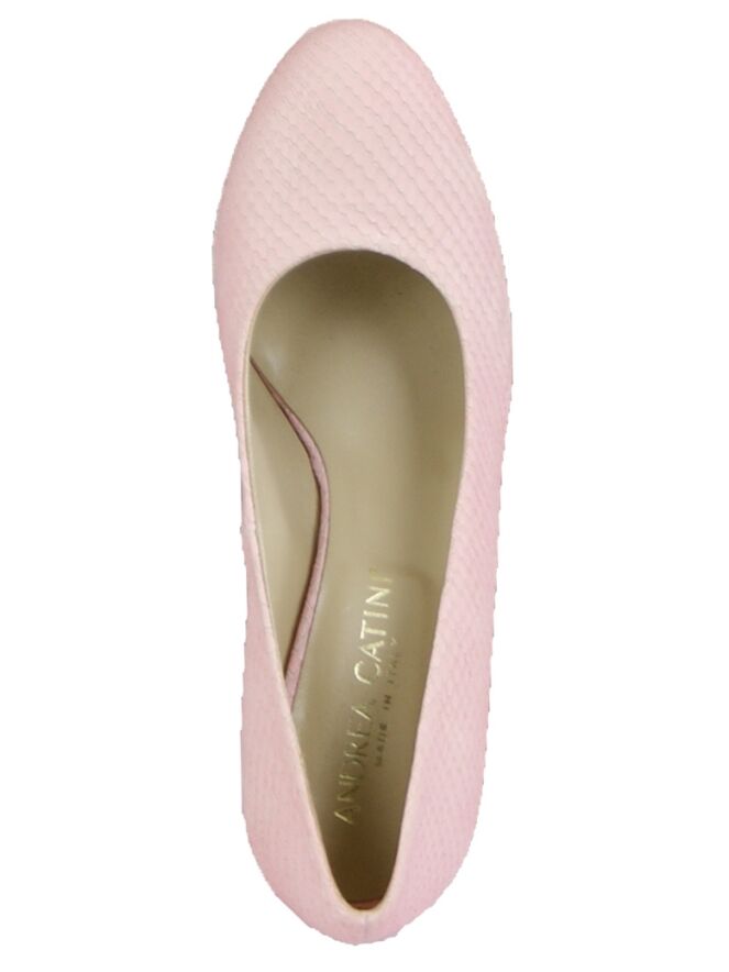 Een pump van het merk Andrea Catini in een frisse roze kleur op een plateauzool. Het leder is in een reptiel structuur en het neusje is rond en de pump heeft een slanke elegante hak die bekleed is in hetzelfde materiaal als de pump zelf