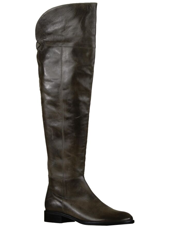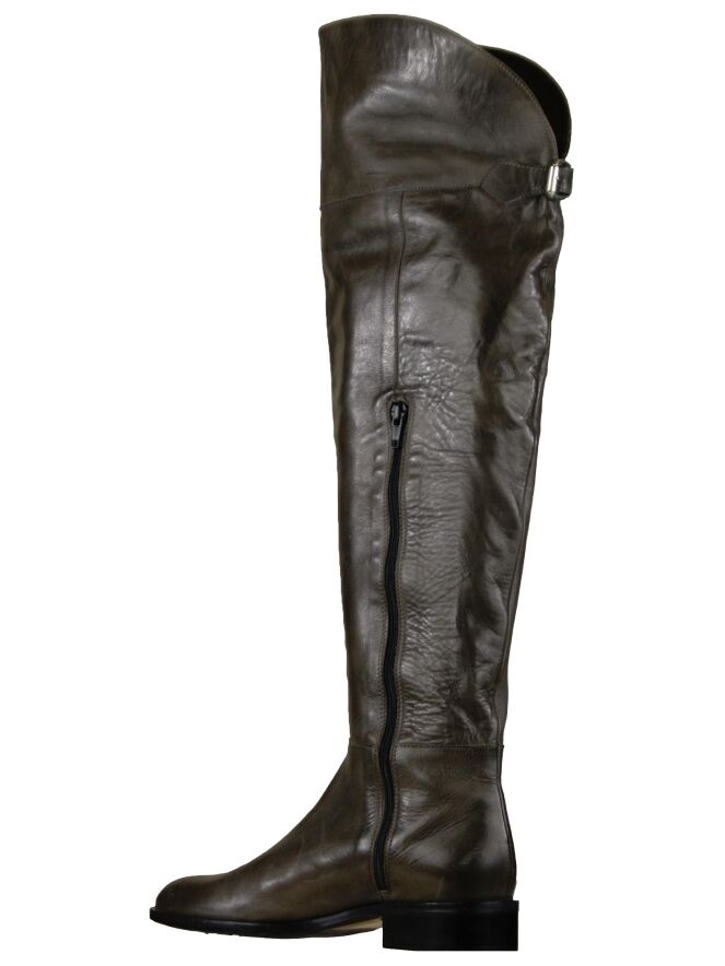 Een kaplaars van het merk Angelo Bervicato in de kleur donkerbruin. Aan de achterzijde van de laars is een zilver kleurige gesp en de rits aan de binnenzijde is vanaf de zool tot halverwege de kuit. De hoogte van de schacht is 43 cm tot aan de omslag en de omtrek is 39 cm.