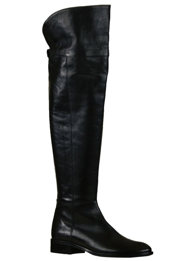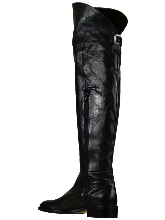 Een lederen kaplaars van het merk Angelo Bervicato in de kleur zwart. Aan de achterzijde van de omslag is een zilver kleurige gesp. De rits aan de binnenzijde van de schacht is vanaf de zool tot halverwege de kuit. De hoogte van de schacht is 44 cm en de omtrek is 38 cm