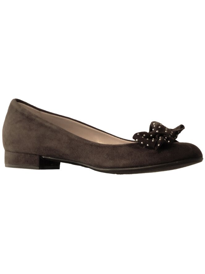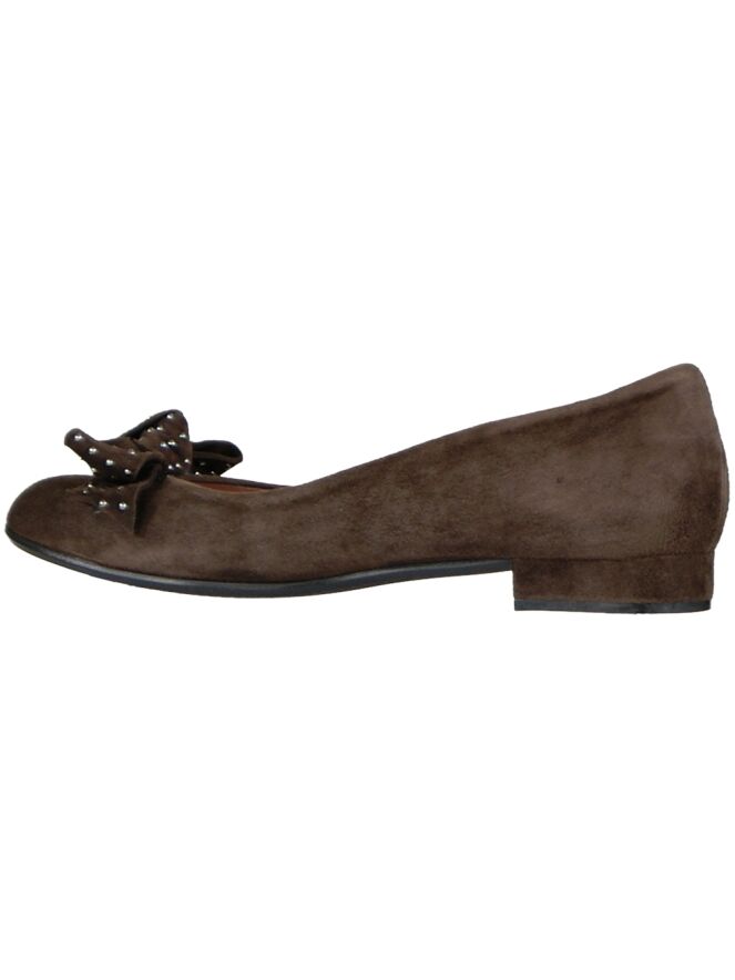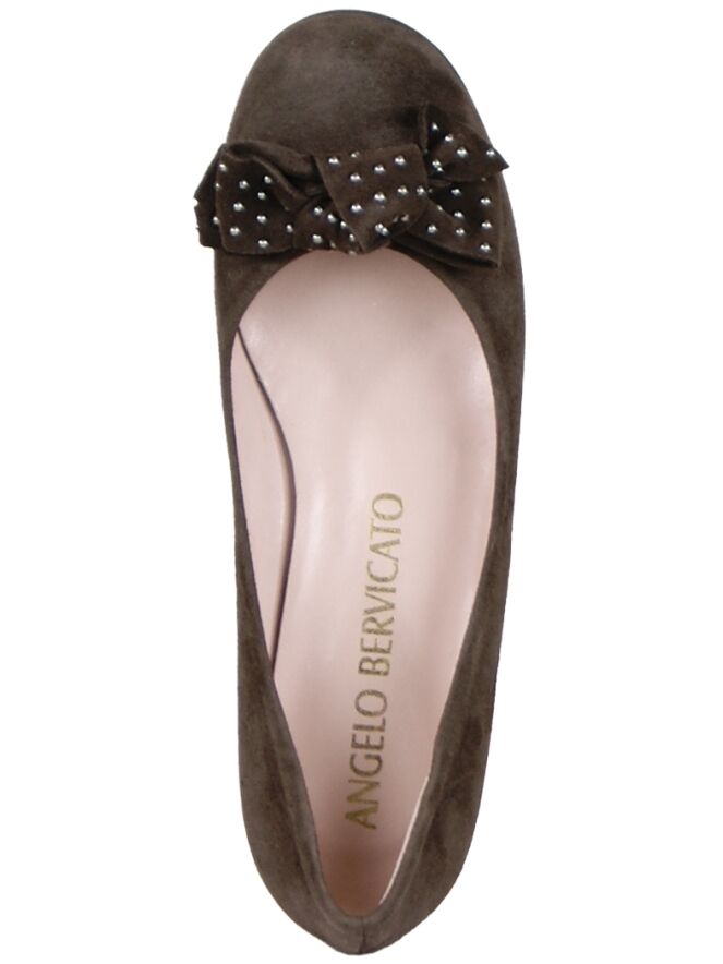 Een ballerina van Angelo Bervicato in de kleur mokka bruin. Op de voorvoet is een strik met decoratieve parelltjes. De binnenkant van de ballerina is met leder gevoerd.