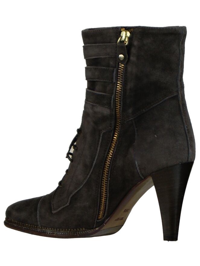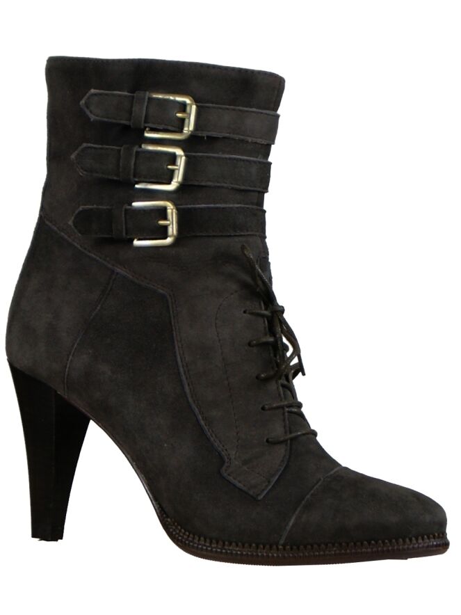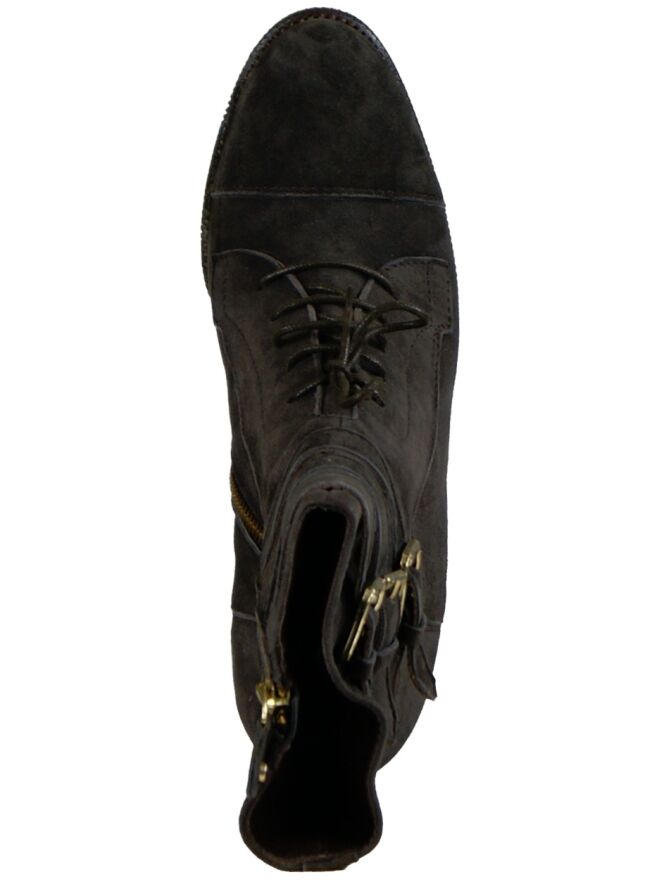 Een laarsje van het merk Angelo Bervicato in de kleur bruin. Over de voorvoet van het laarsje is een veter en over de korte schacht zijn 3 riempjes met messing gespen. De binnenkant van het laarsje is met leder gevoerd.