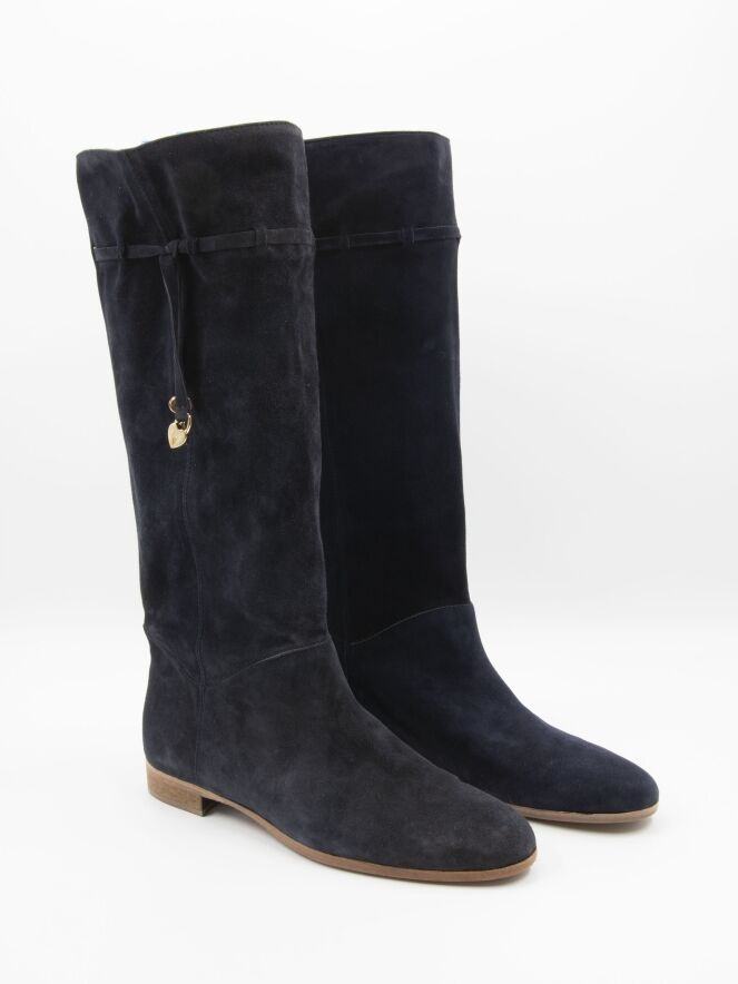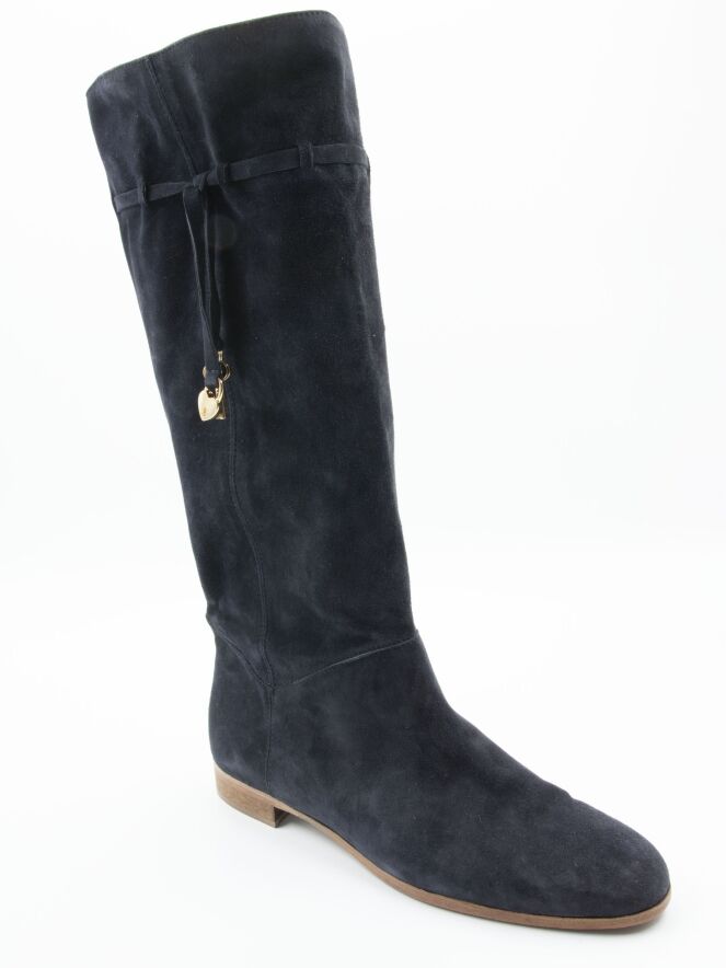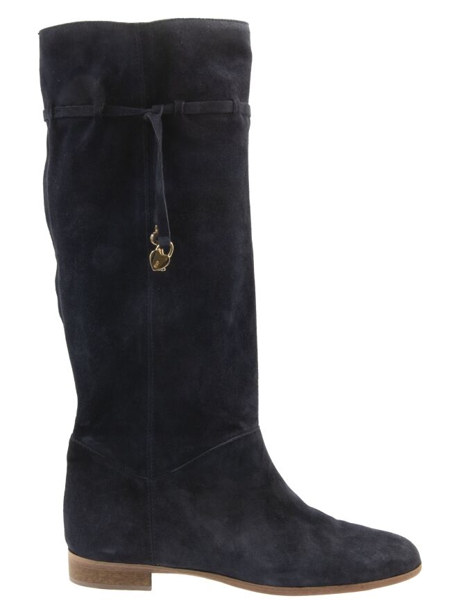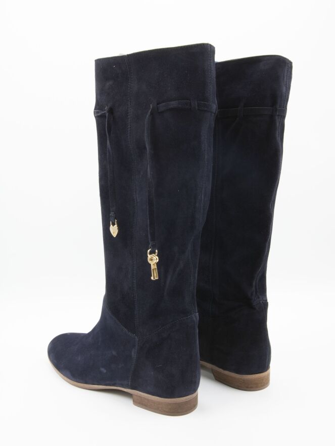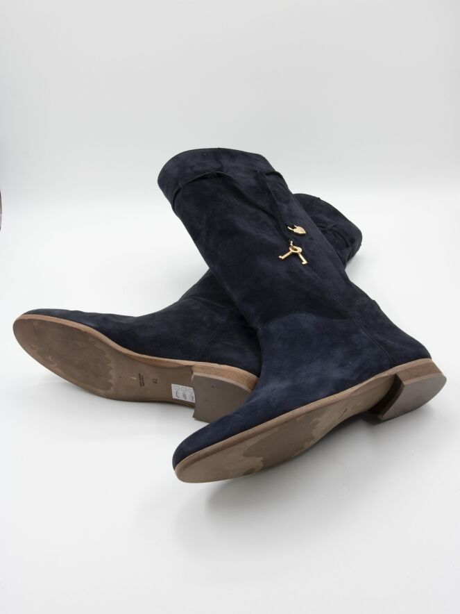 Een laars van het merk Angelo Bervicato in een marine blauwe kleur. De schacht is zacht en zakt iets naar beneden. Aan de bovenzijde van de schacht is een smalle bies met aan de uiteinden 2 goud kleurige sleuteltjes en een sier slotje. De hoogte van de schacht is 38 cm en de omtrek is 40 cm.