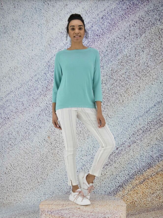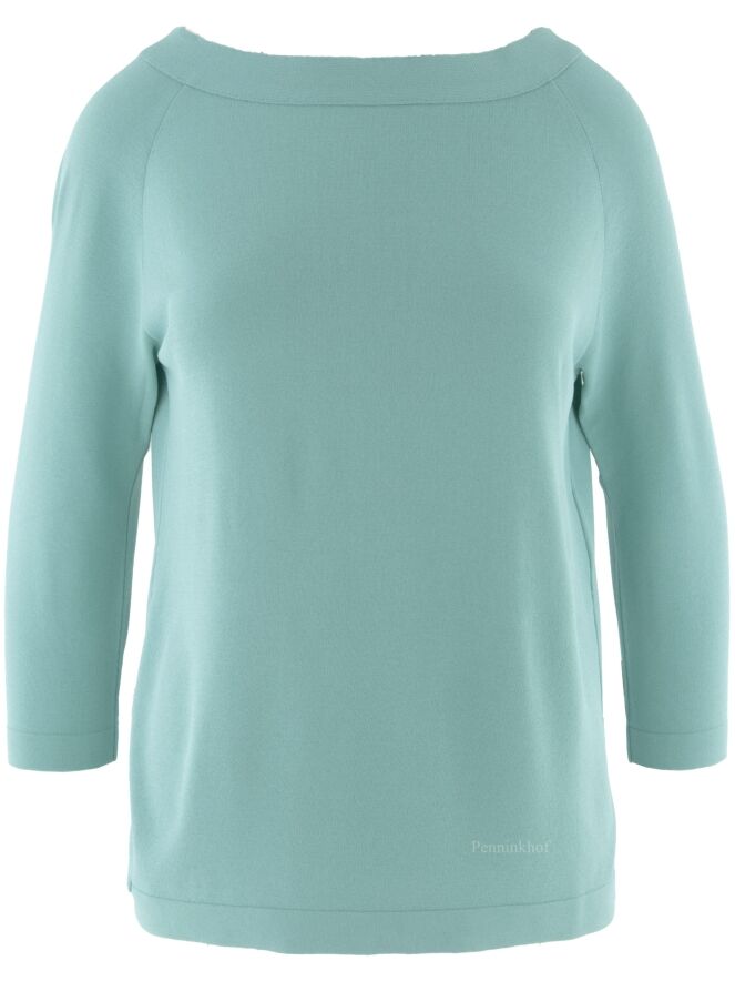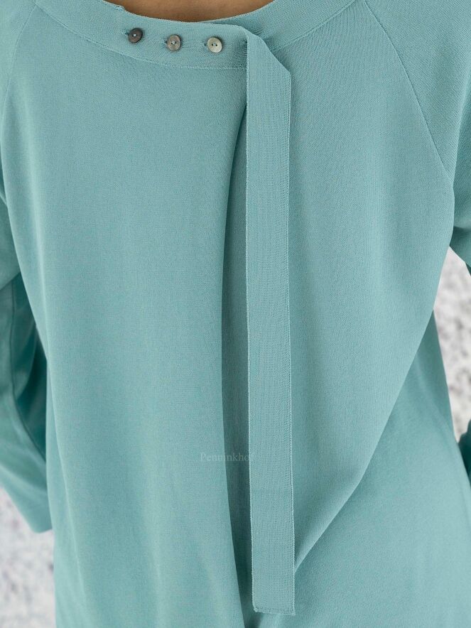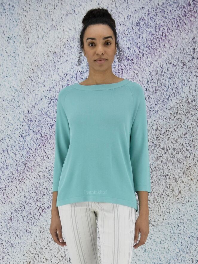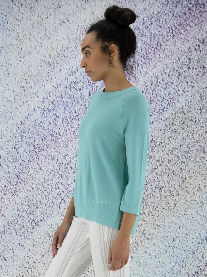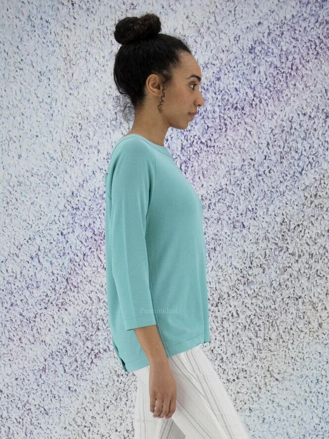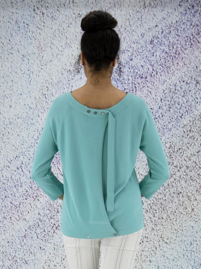 Een shirt van Annette Görtz in de kleur turquoise. Het shirt heeft een brede ronde hals en halflange mouwen. Aan de achterzijde is een overslag met knoops sluiting aan de onderkant en in de hals. Dit shirt mag op de hand worden gewassen.