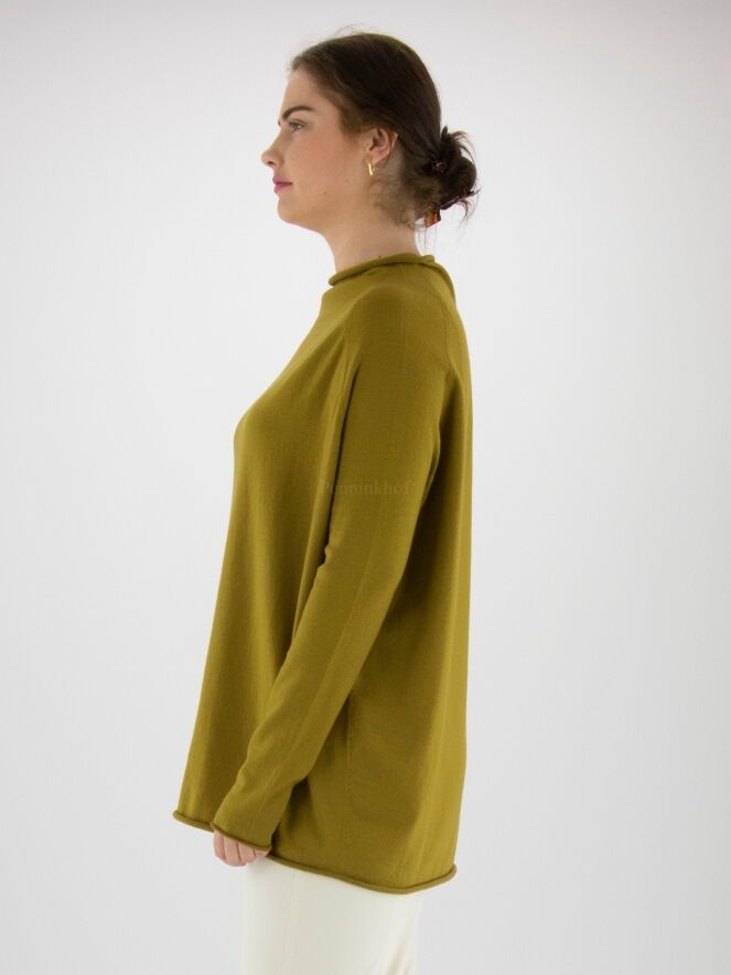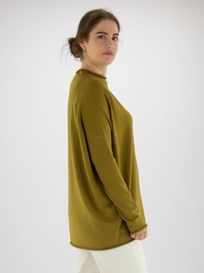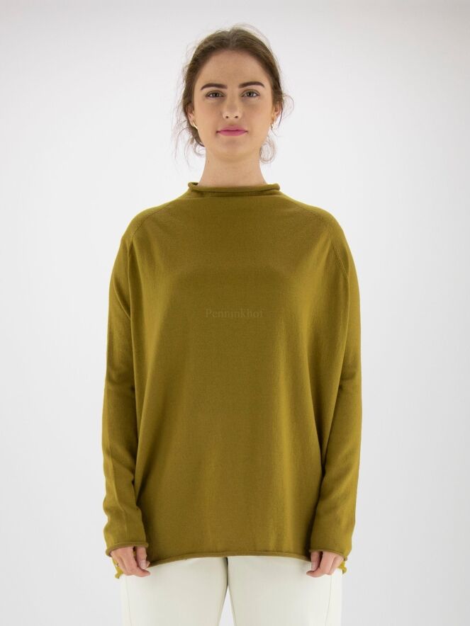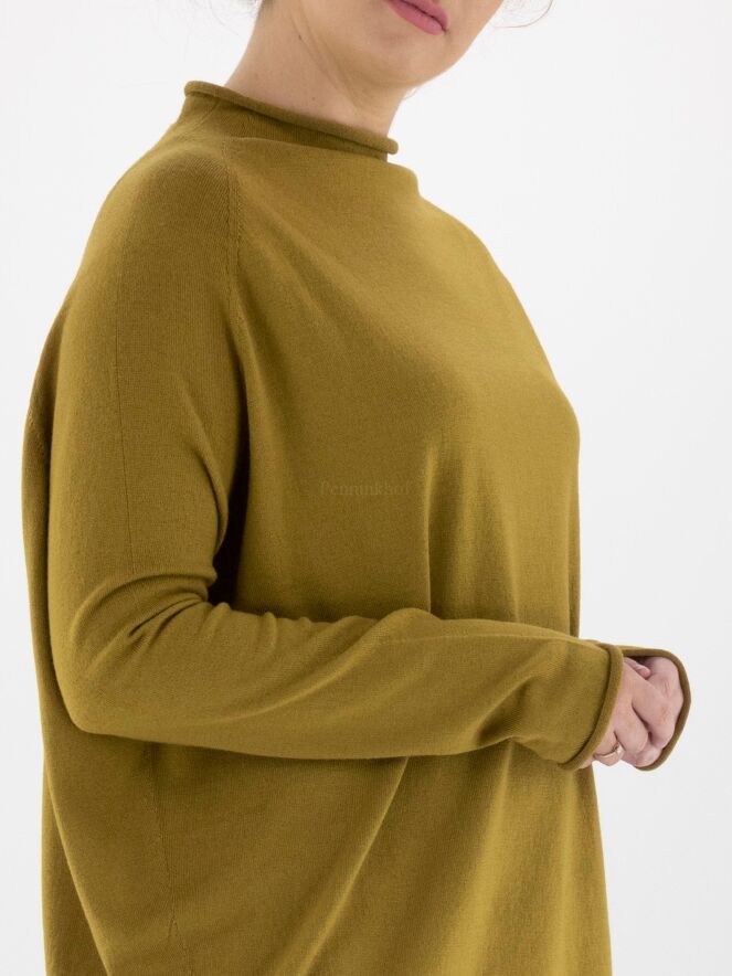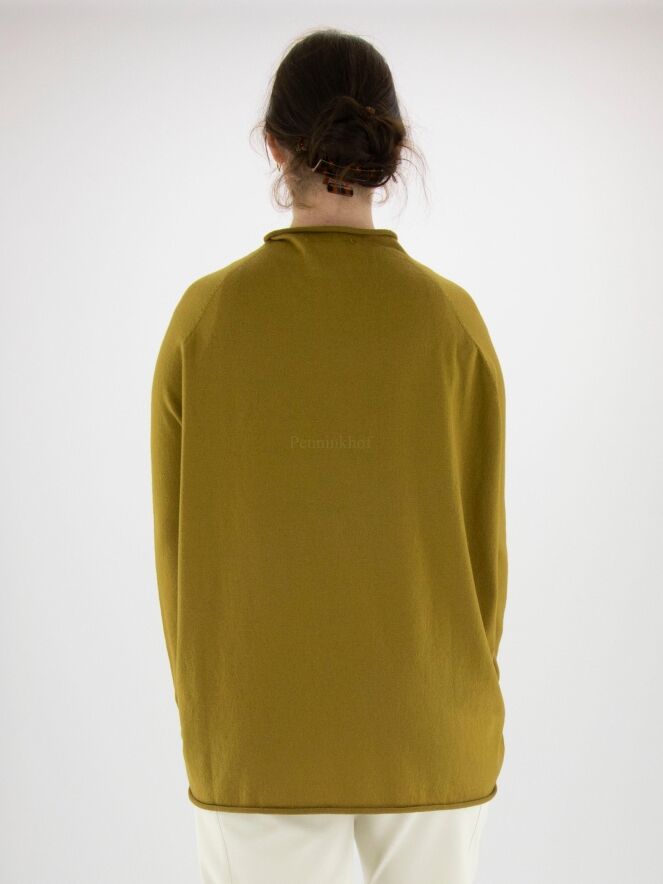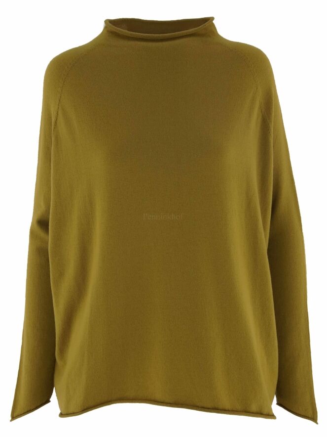 Een luxe ruime pullover van Annette Görtz in de kleur okergeel. De rand van de ronde hals, uiteinde van de mouwen en de onderkant is geruld. Deze pullover mag op de hand worden gewassen.