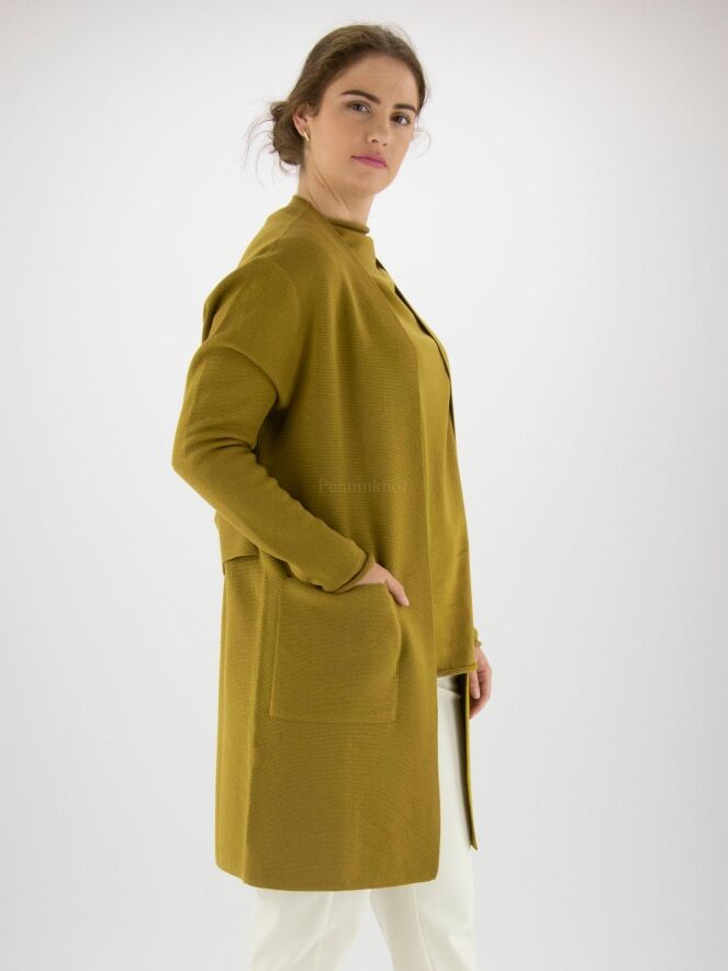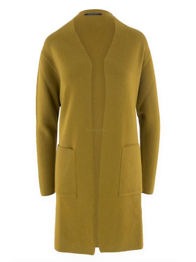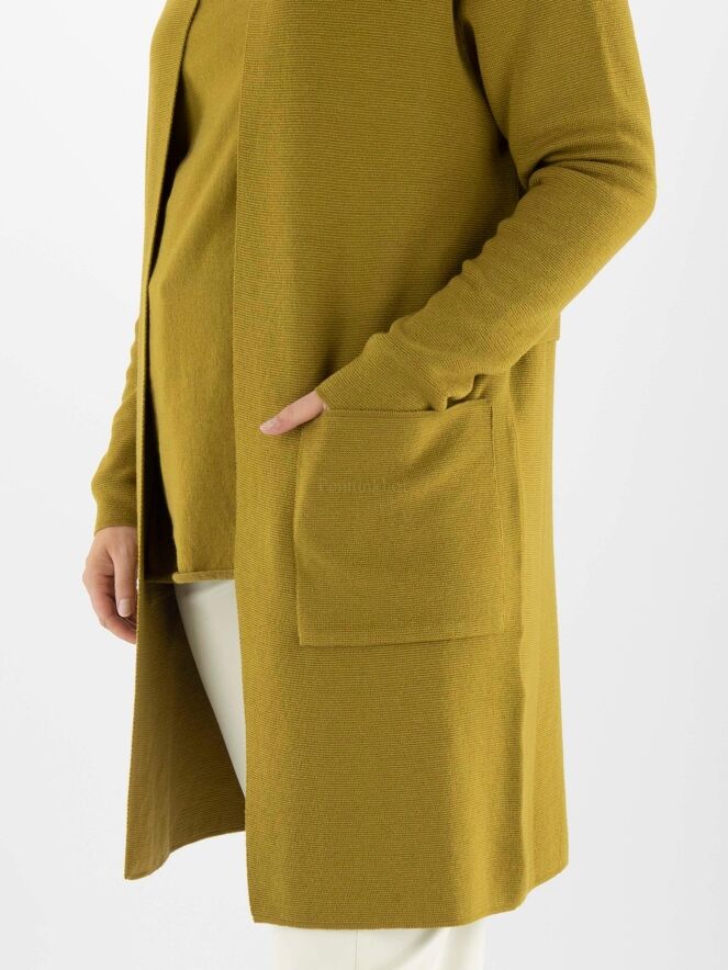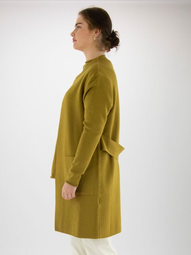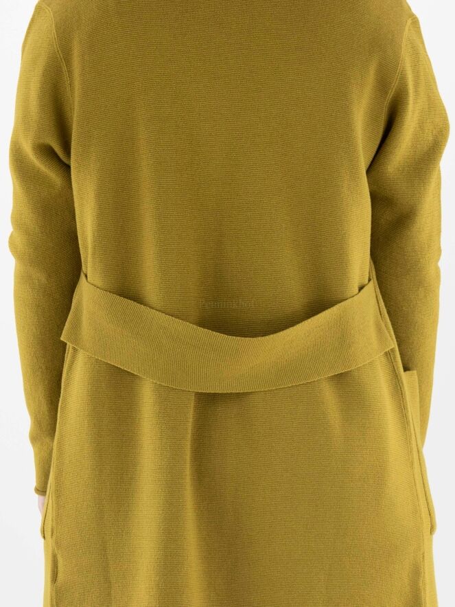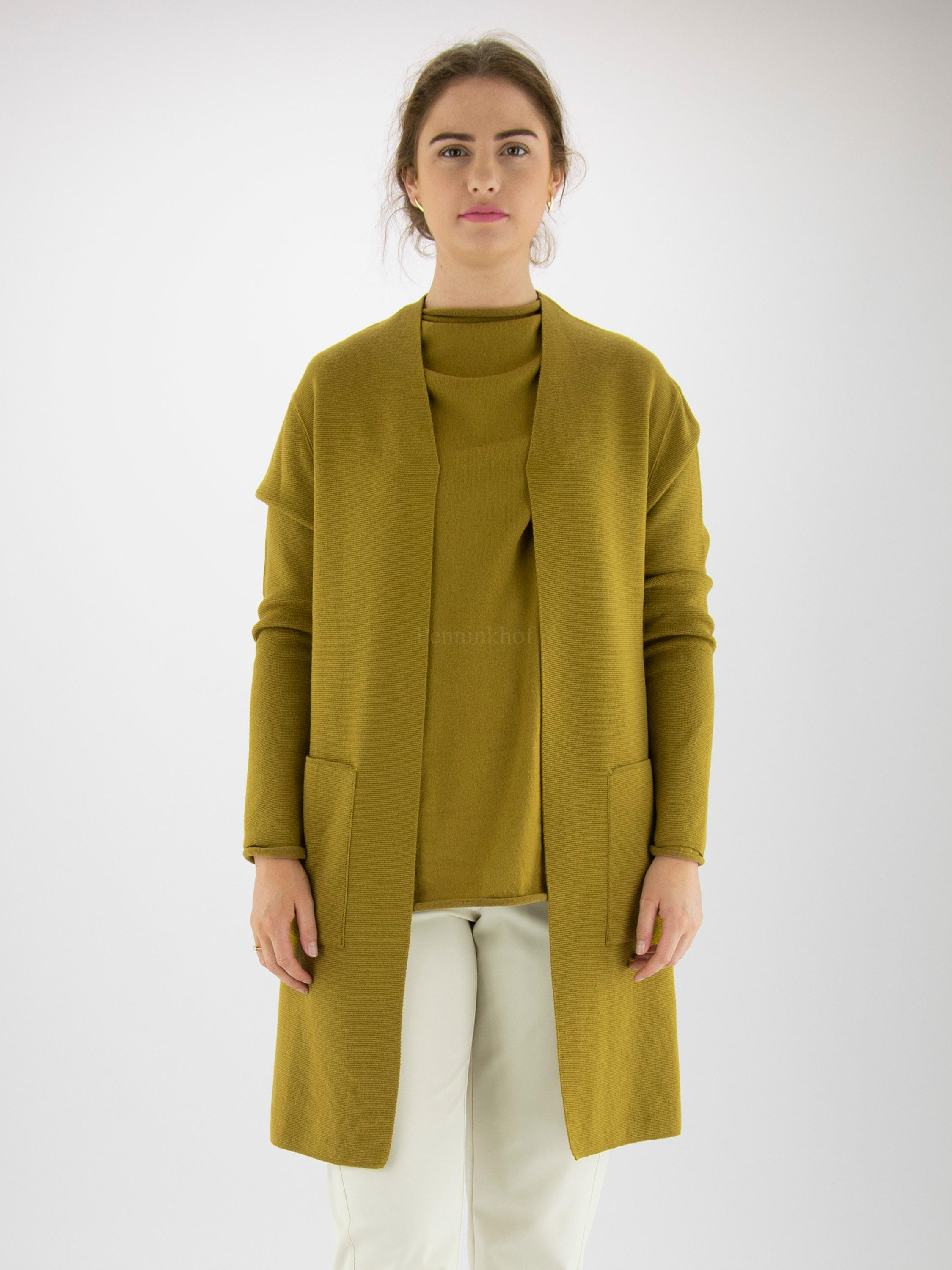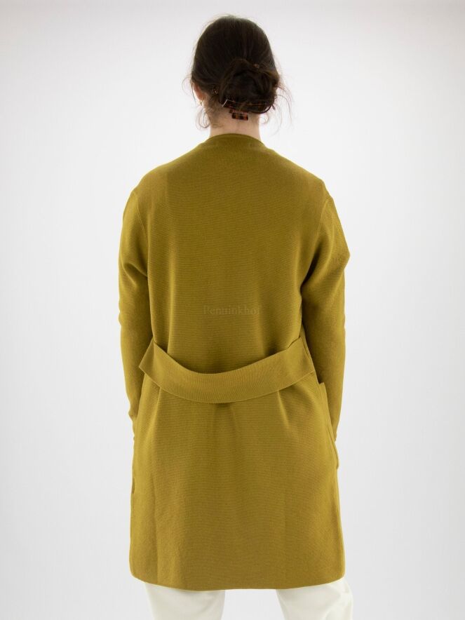 Een luxe vest van Annette Görtz in de kleur okergeel. In de taille is een ceintuur in dezelfde stof als het vest. Het vest heeft geen sluiting en mag op de hand worden gewassen.